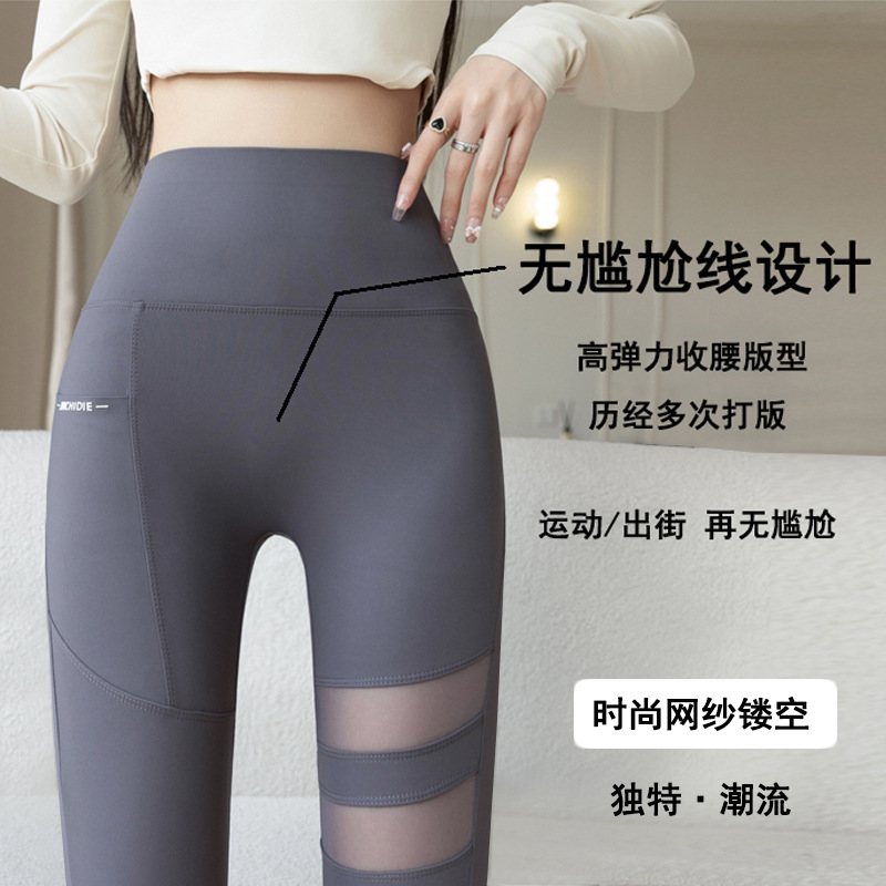 秋新款九分鲨鱼裤女高腰侧口袋紧身芭比裤外穿大码蕾丝显瘦打底裤