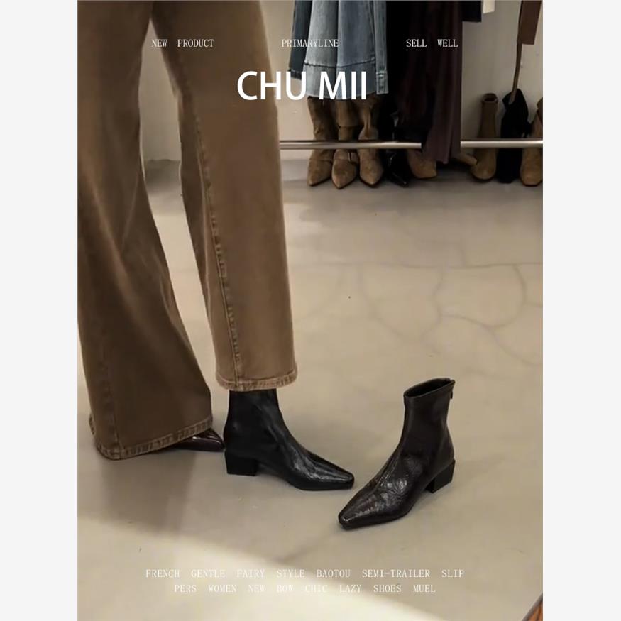 羊皮版~覆古高级感尖头短靴女小众粗跟马丁靴个性软皮弹力瘦瘦靴