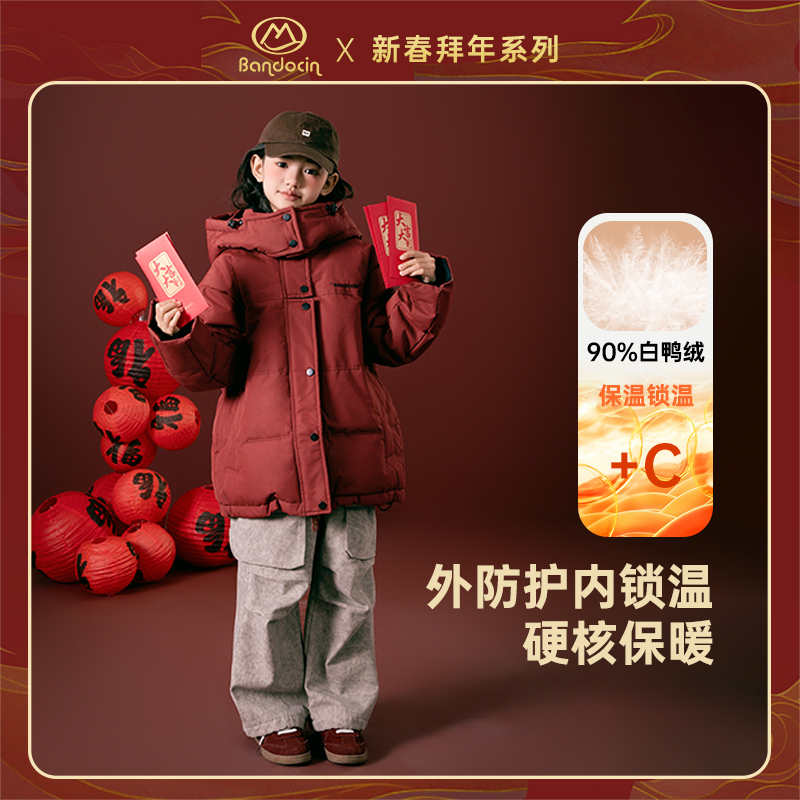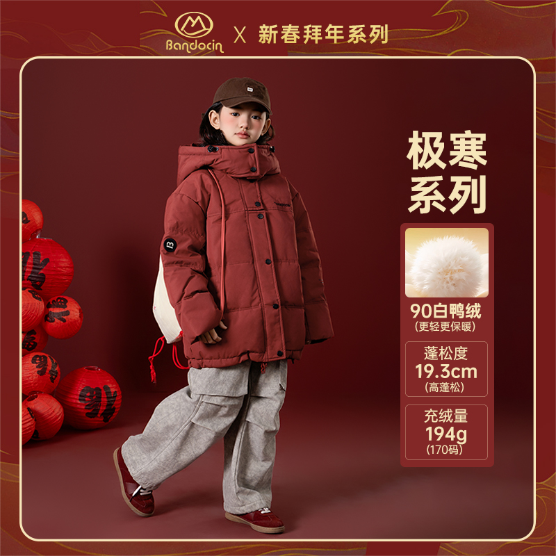 半度闲女童新年红色羽绒服冬装儿童加厚拜羽绒服鸭绒外套