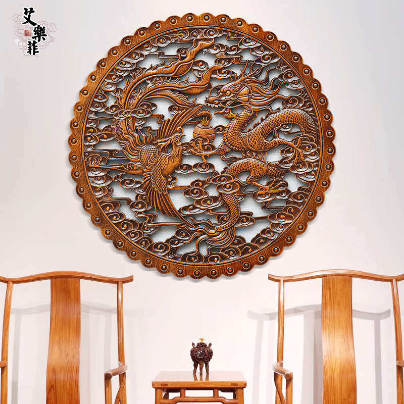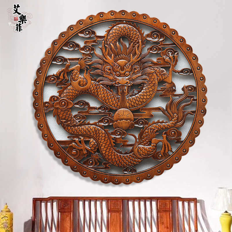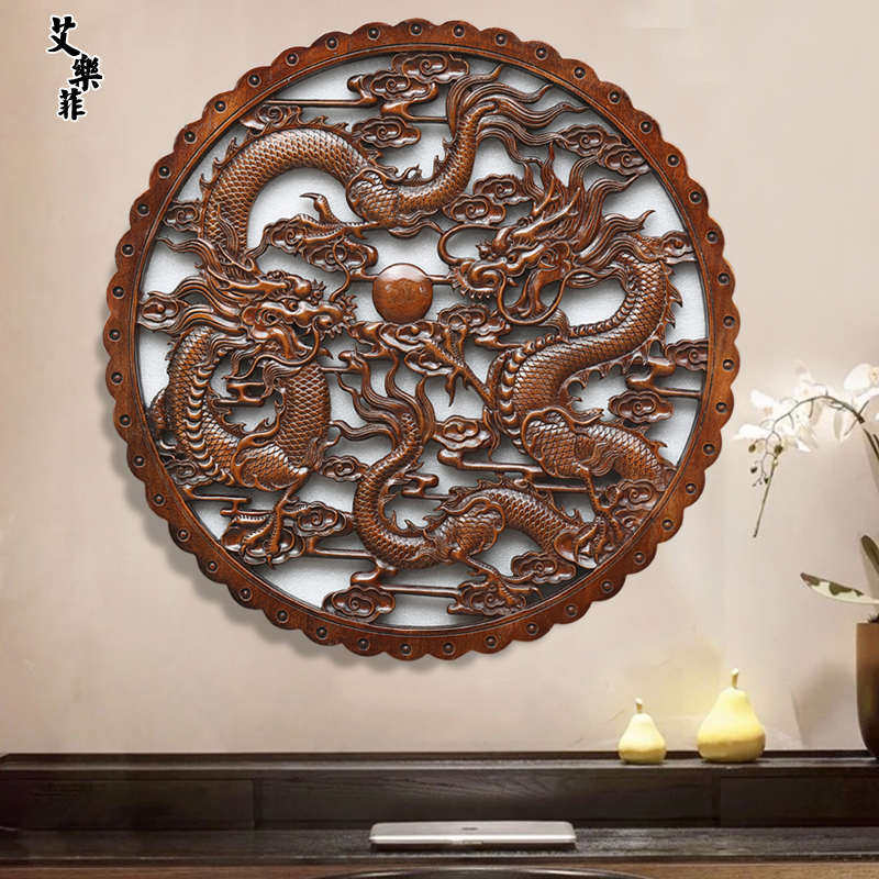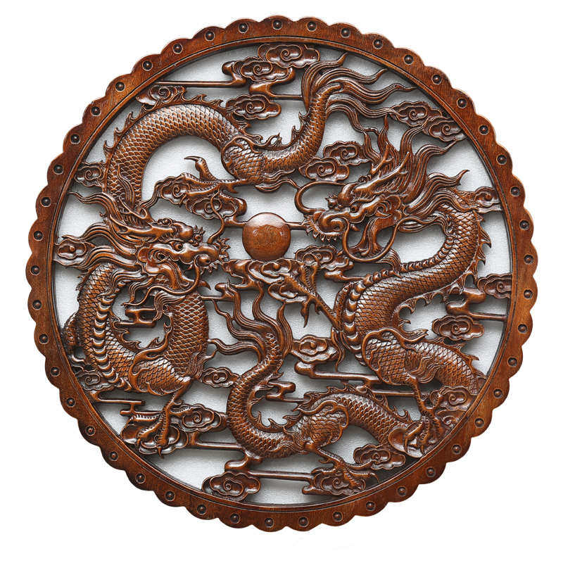 东阳木雕圆形香樟木雕刻工艺玄关客厅中式仿古装修壁饰挂件双龙凤