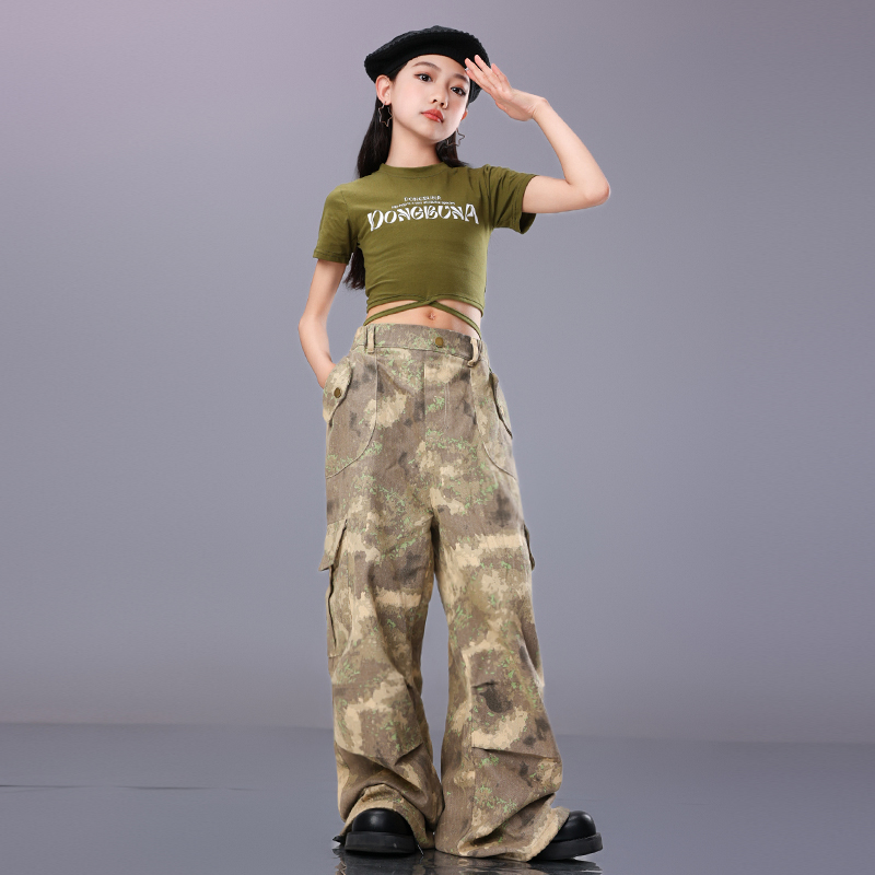 新款女童爵士舞服装街舞儿童潮服迷彩工装裤jazz嘻哈套装走秀表演