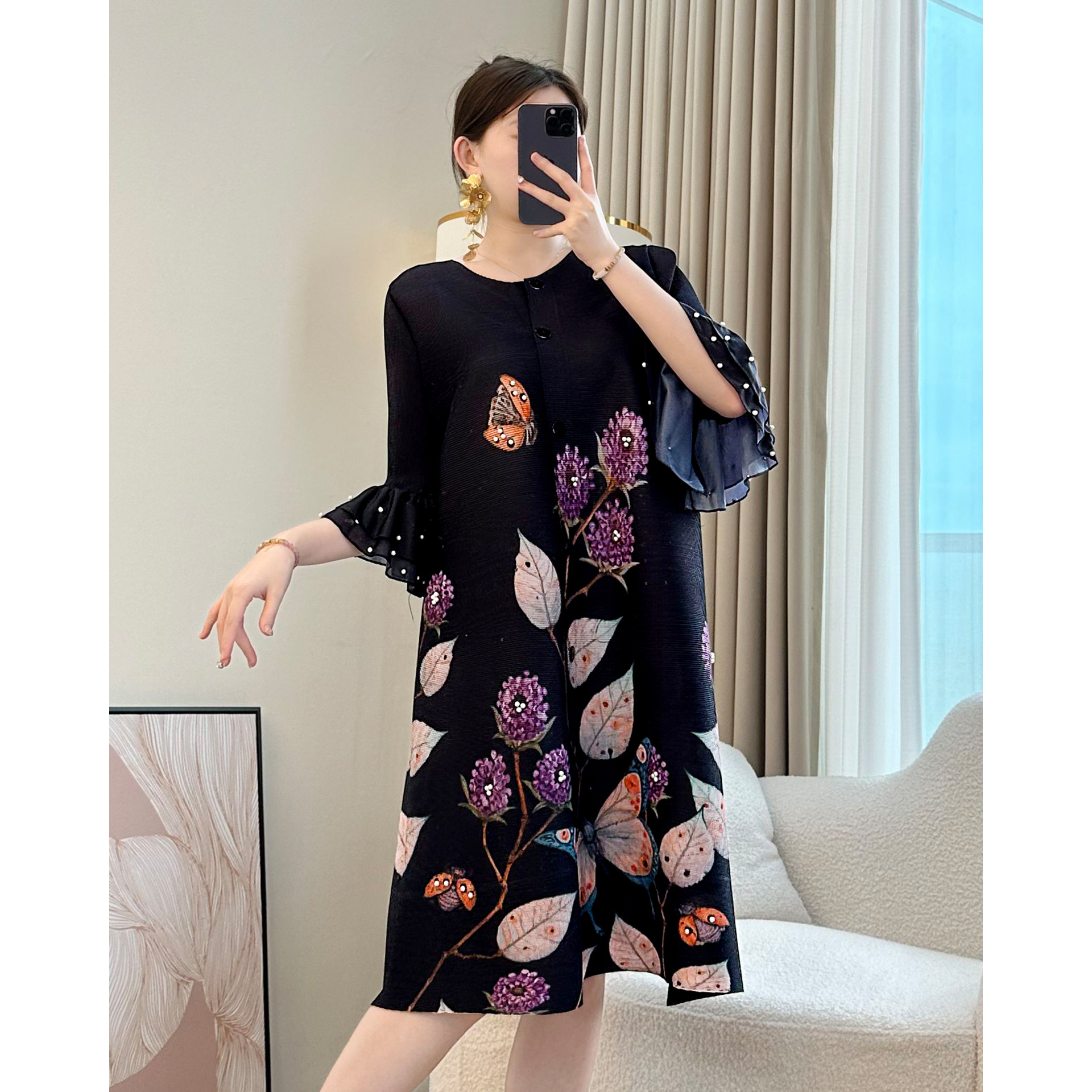 2025夏季新款气质妈妈减龄白色宽松开衫大码a字褶皱印花连衣裙