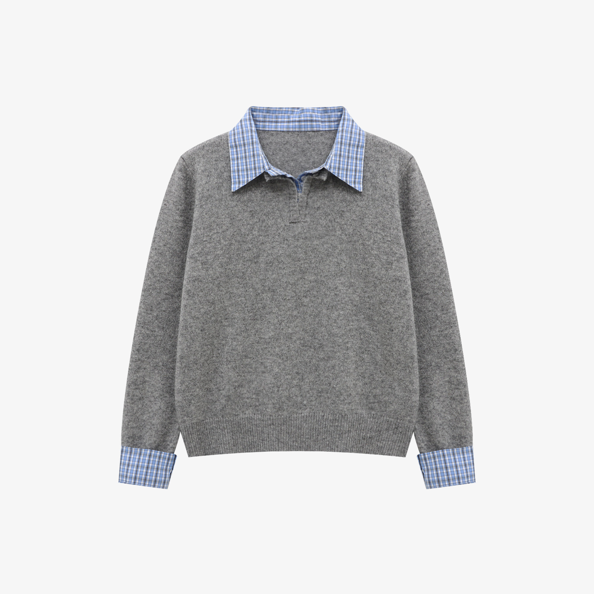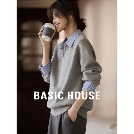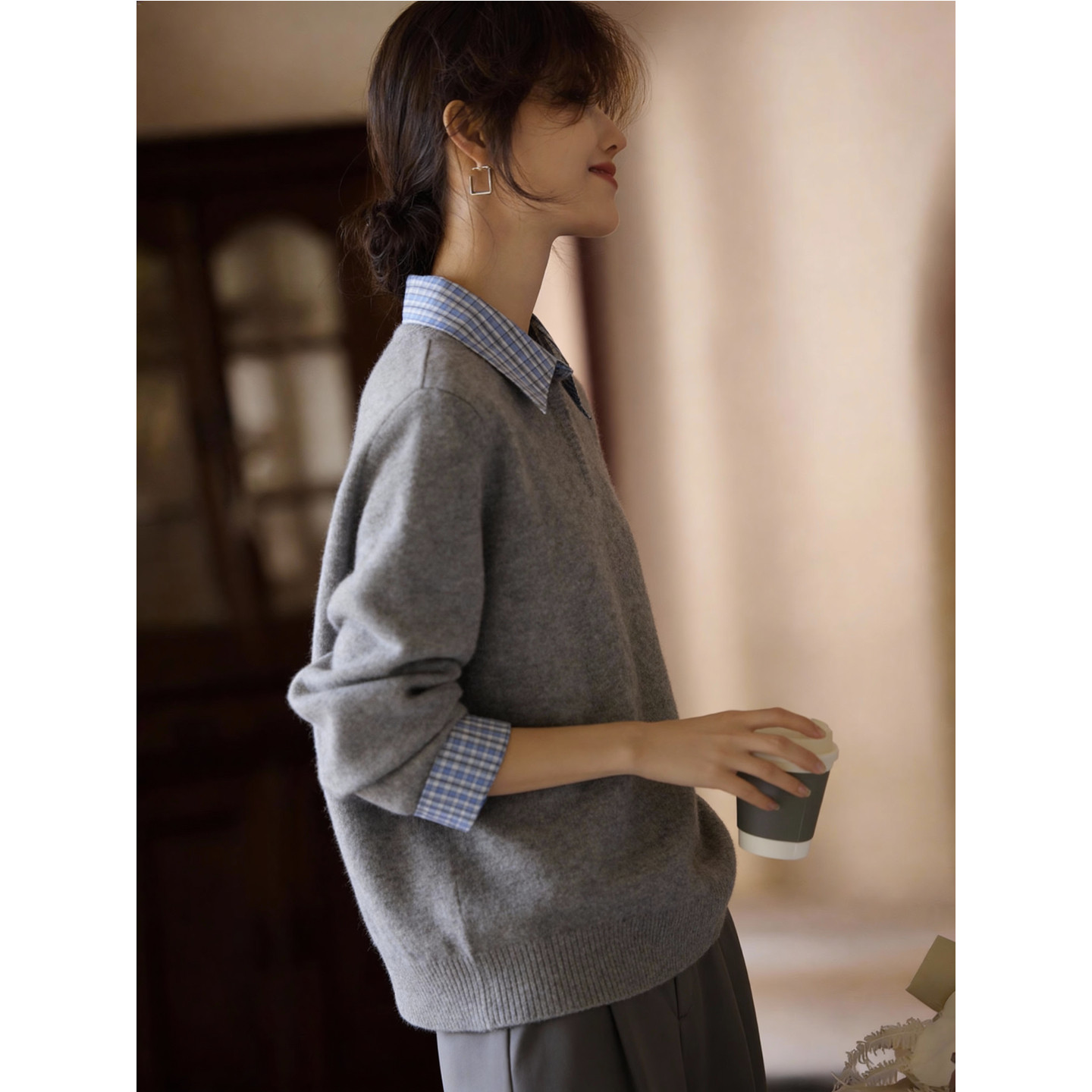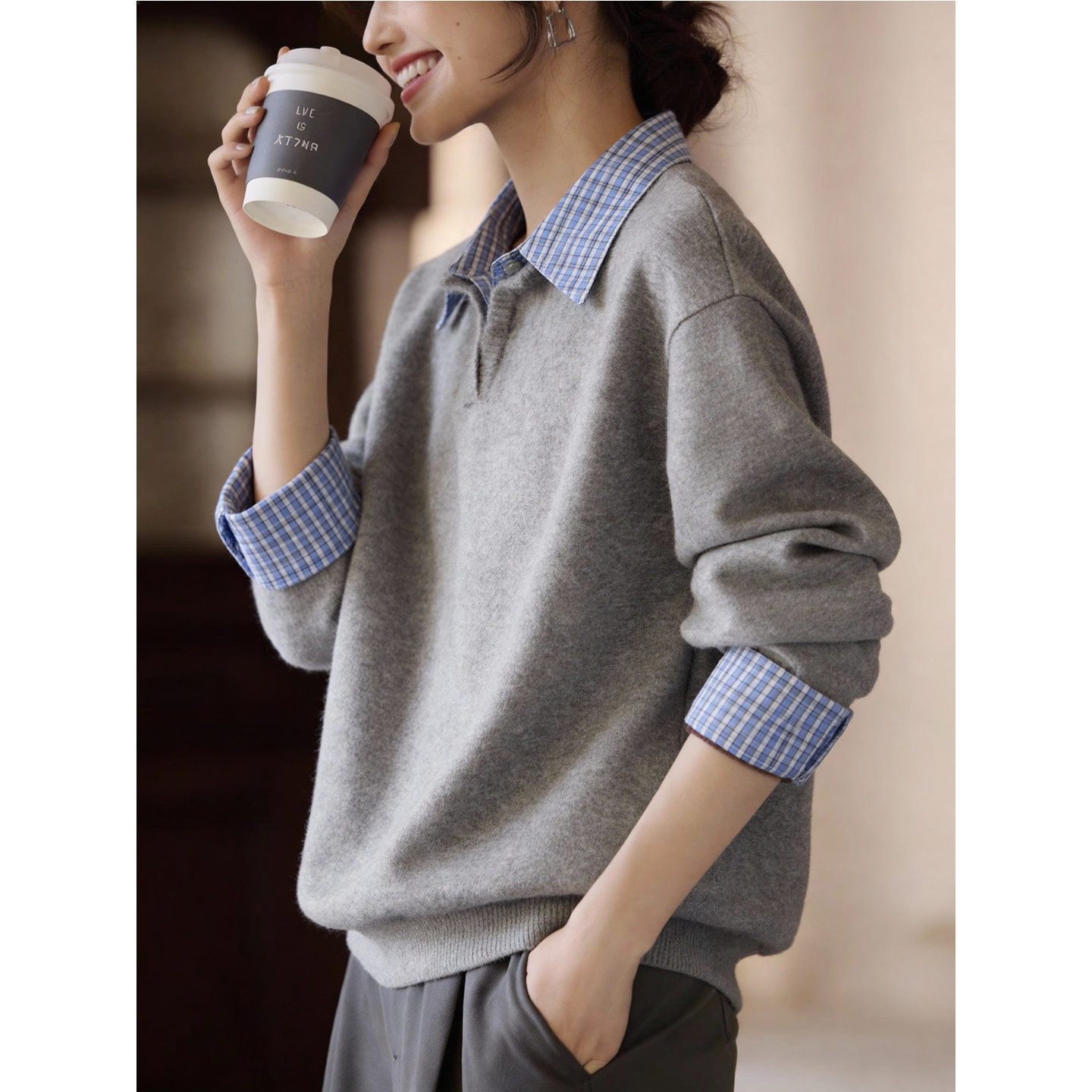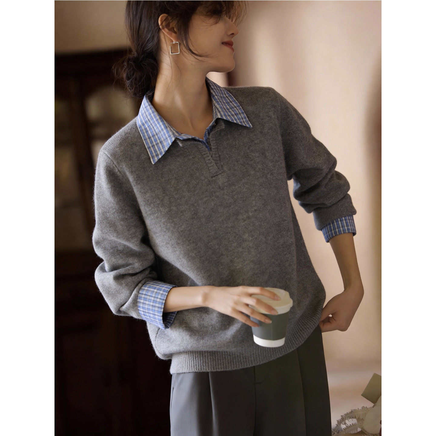 百家好灰色假两件针织衫上衣26春季新款女士格纹拼接翻领衬衫毛衣