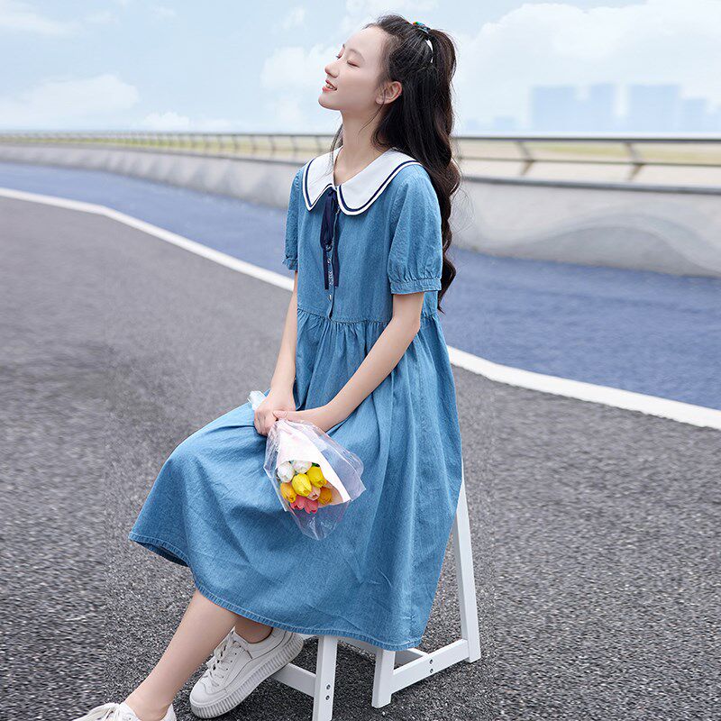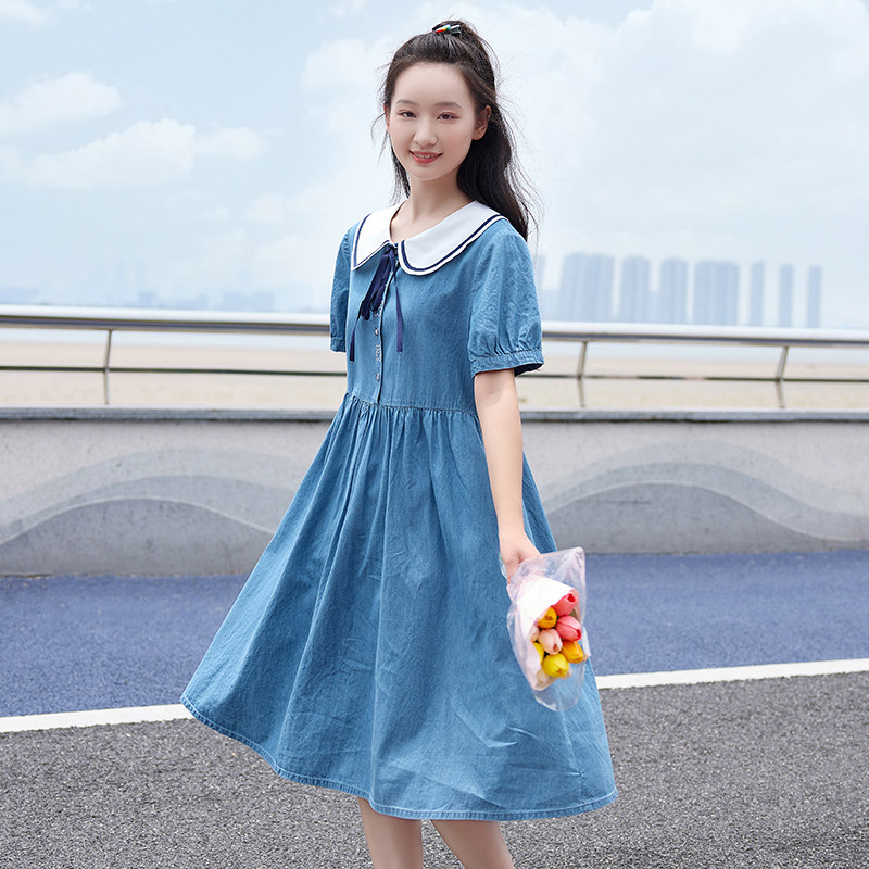 少女牛仔裙白色初中生连衣裙夏装中学生裙子大童新款高中生学院风
