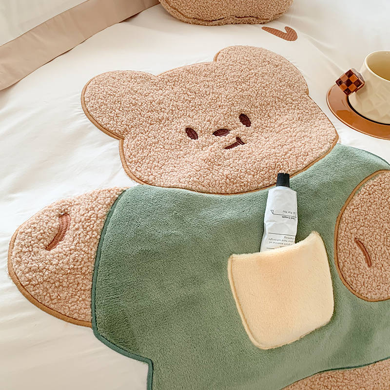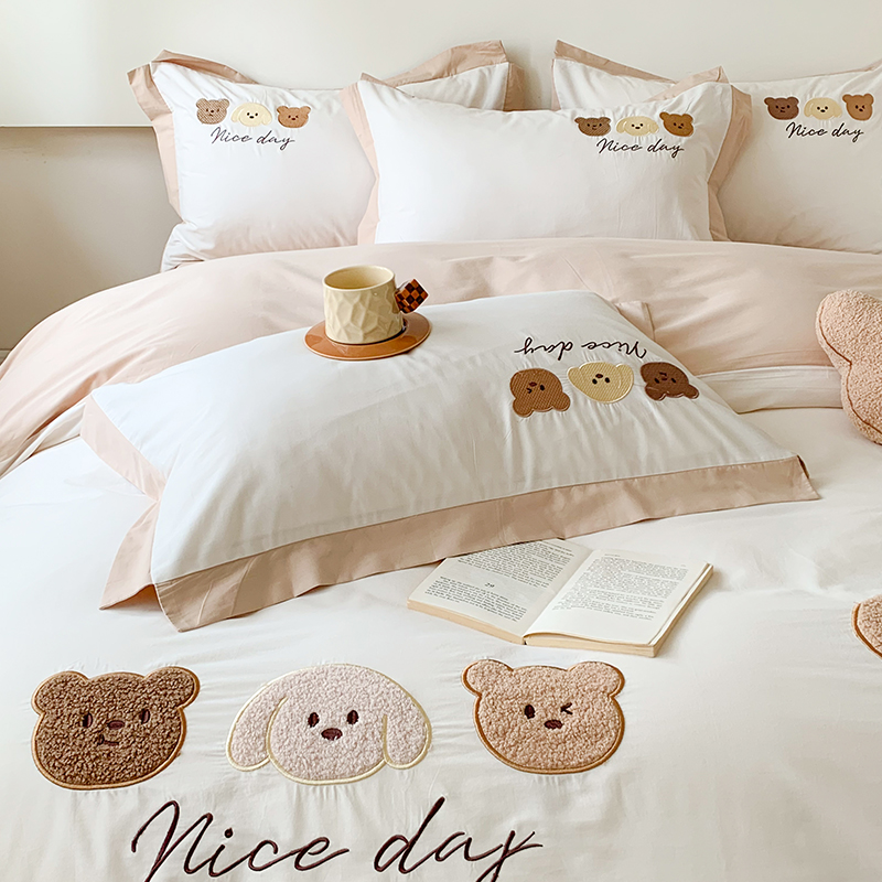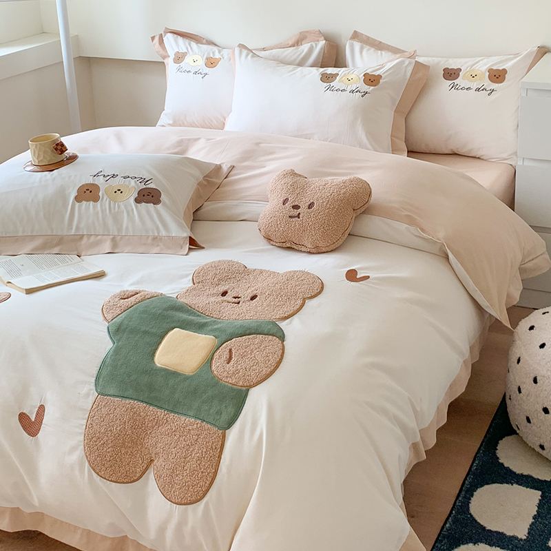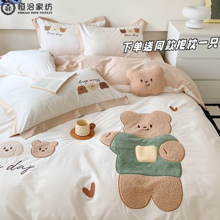 送抱枕卡通风全棉水洗棉四件套儿童熊毛巾绣纯棉1.2m被套床品咖色