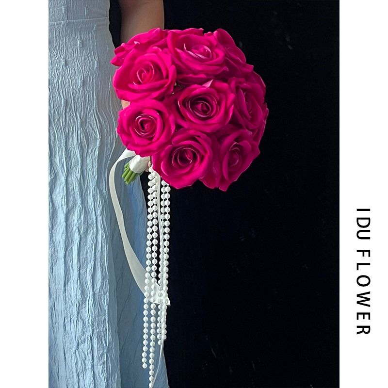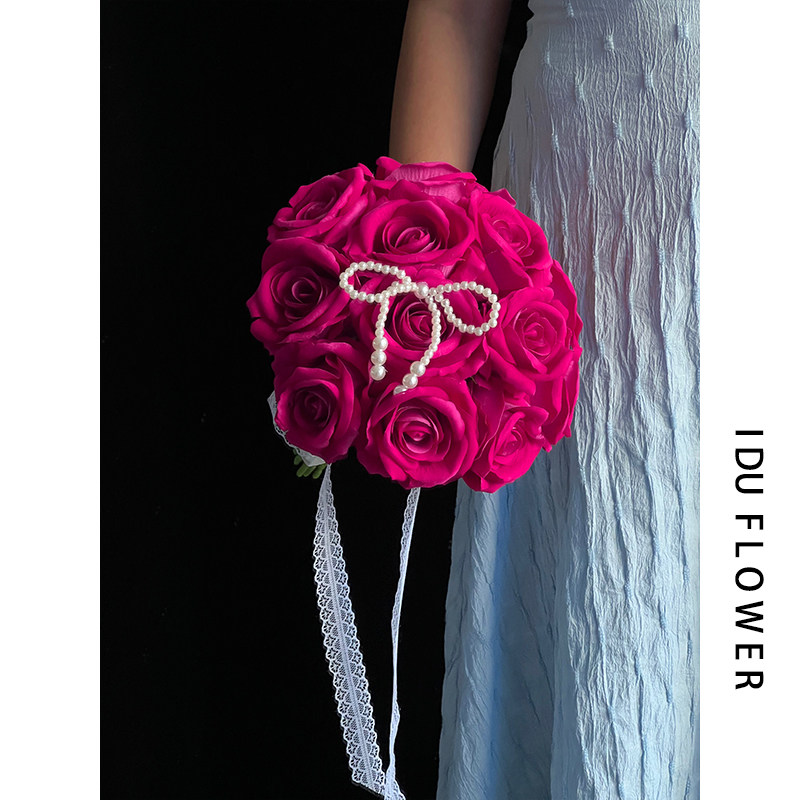 复古新娘手捧花弗洛伊德玫瑰花仿真花婚礼结婚花束拍照红色花球