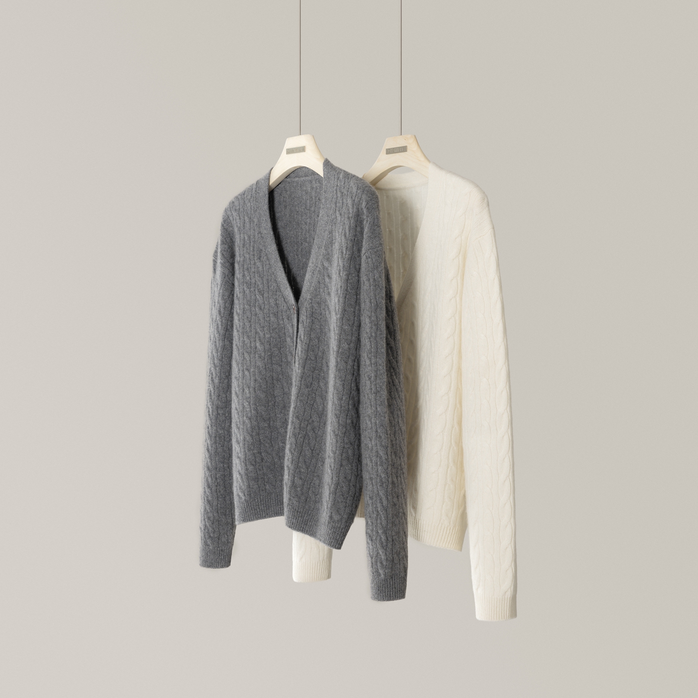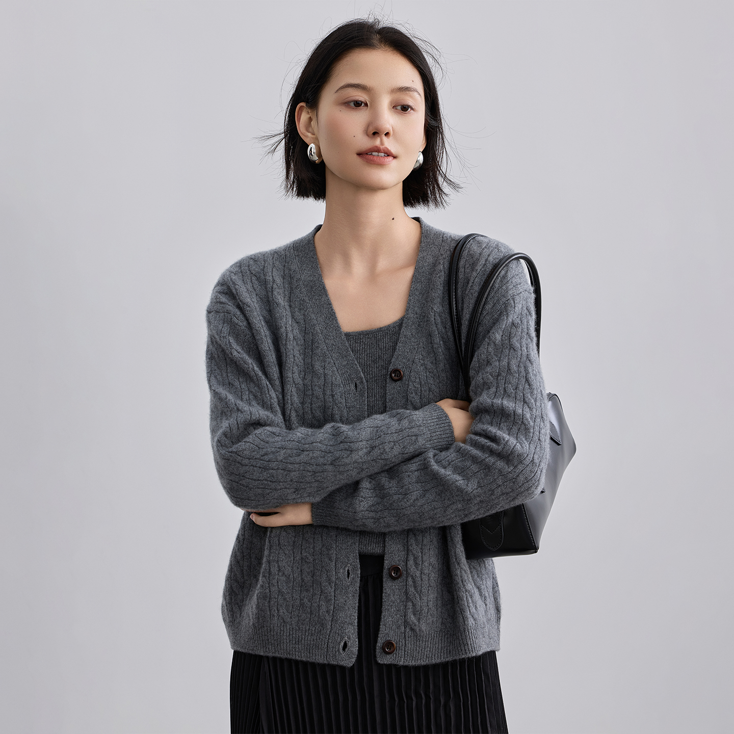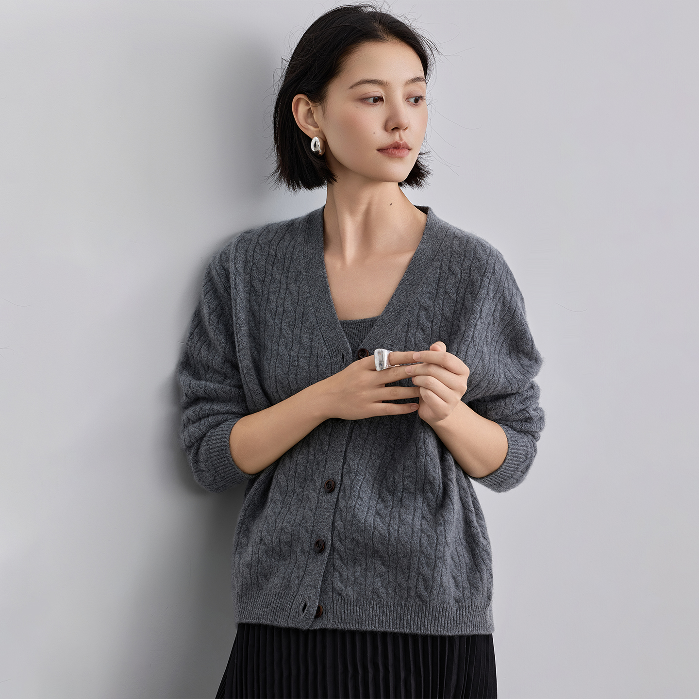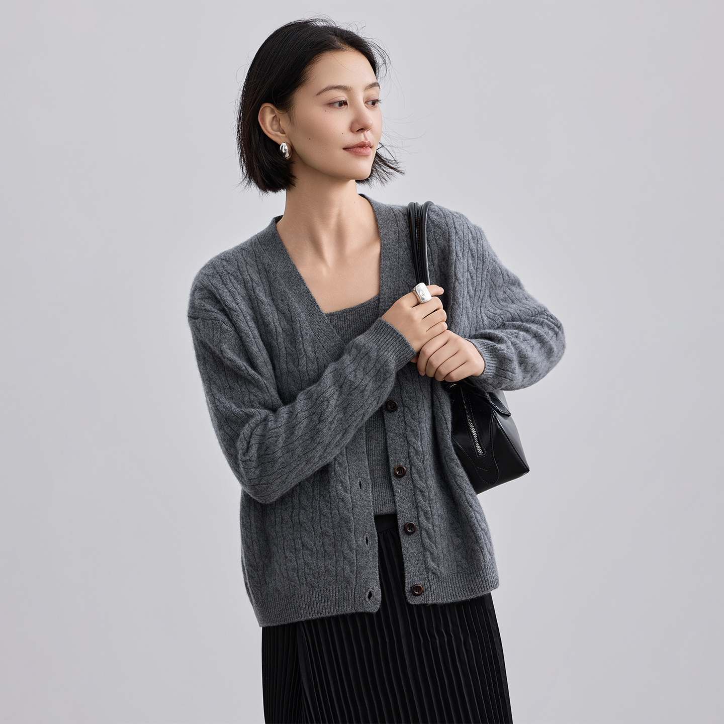 2025秋冬新款加厚100纯山羊绒衫女V领麻花针织开衫毛衣外套慵懒风