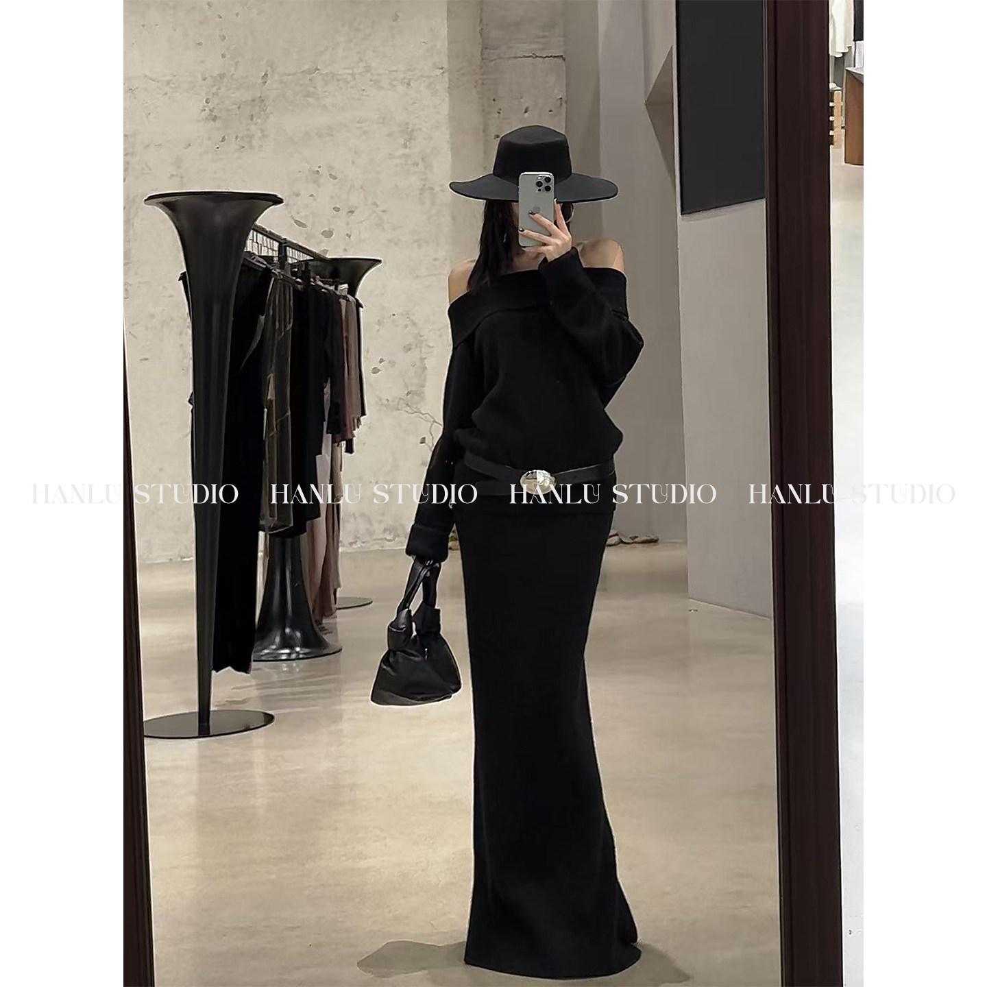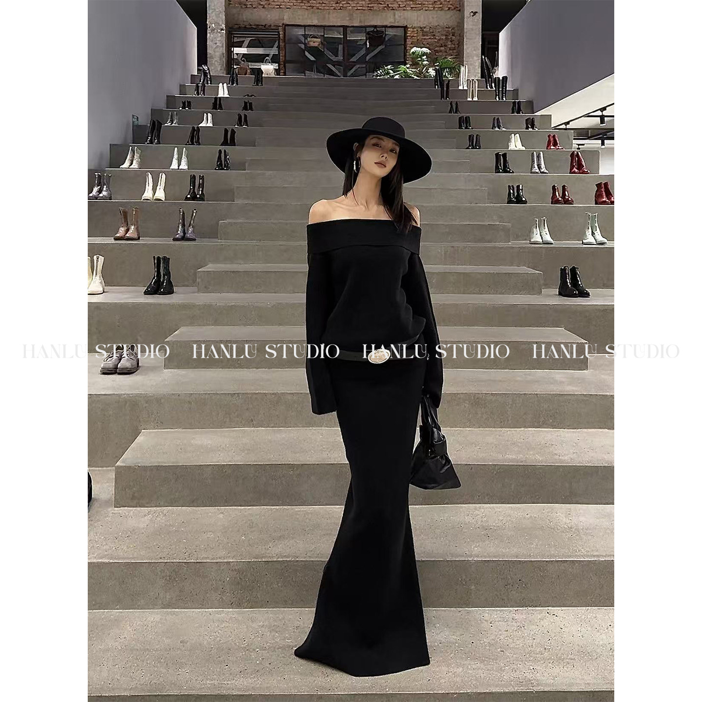 HanLu studio原创姐感抹胸连衣裙紧身收腰黑色毛织半身长裙鱼尾裙