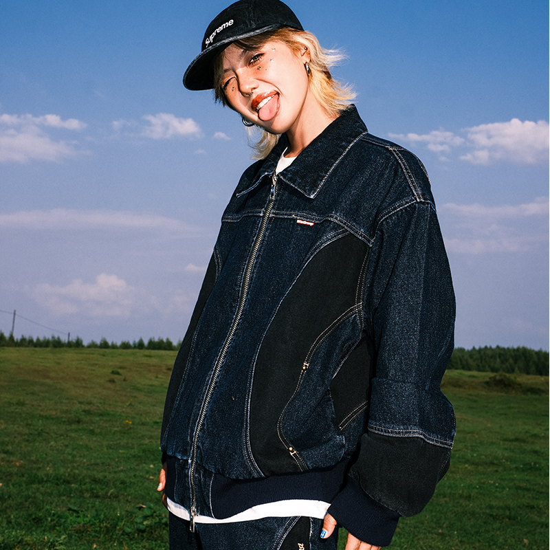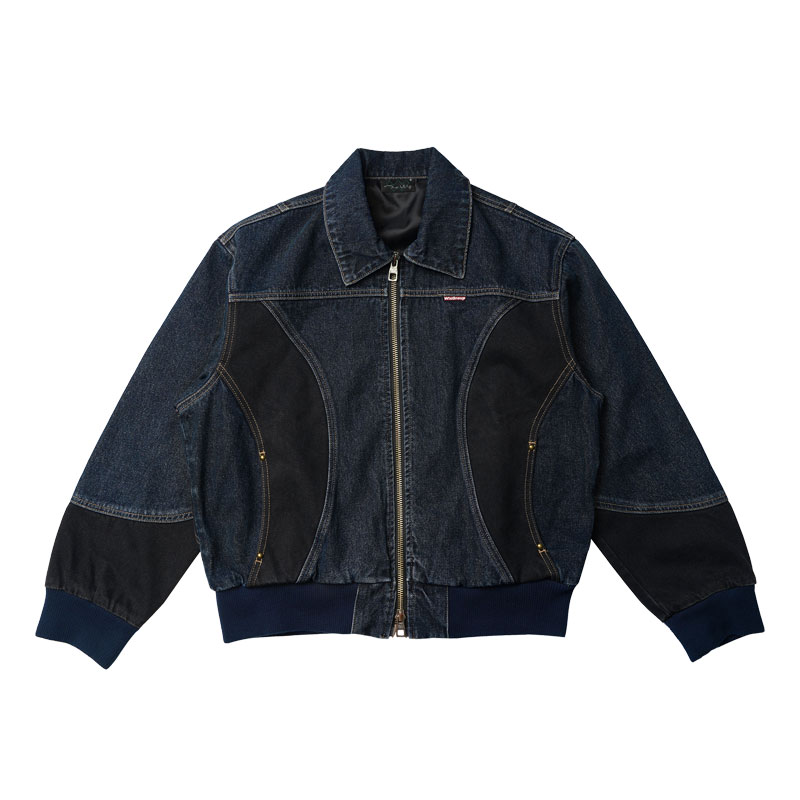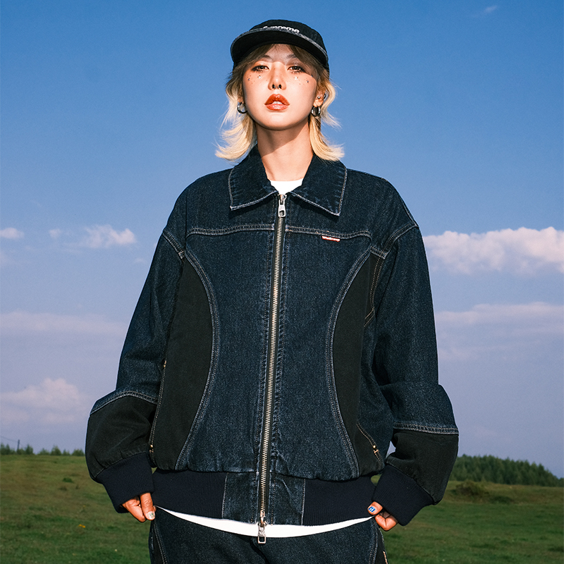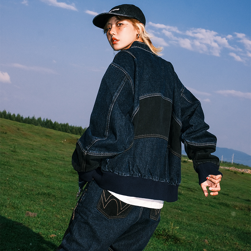 THEWIZBRAND 秋冬美式复古弧形拼色水洗牛仔夹克外套宽松男女同款