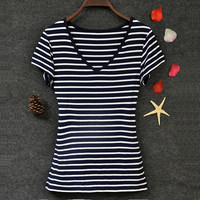 2025包邮大码女装莫代尔T恤欧美条纹修身显瘦上衣v领短袖女打底衫