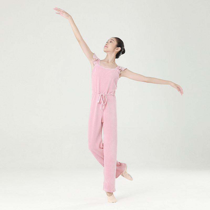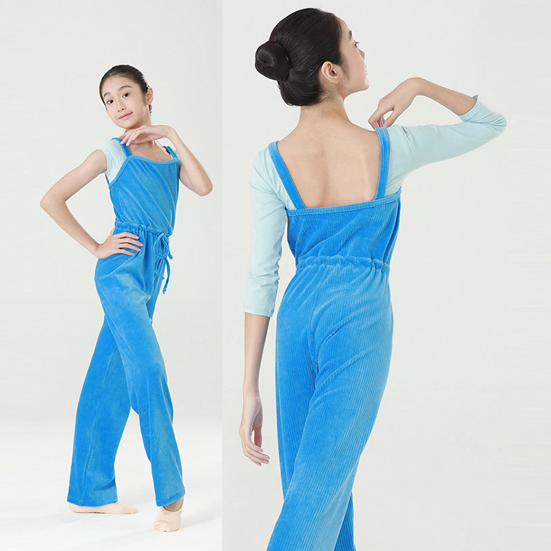 Sansha芭蕾舞服女蓝色保暖竖条绒连体长裤吊带练功服收腰舞蹈服装