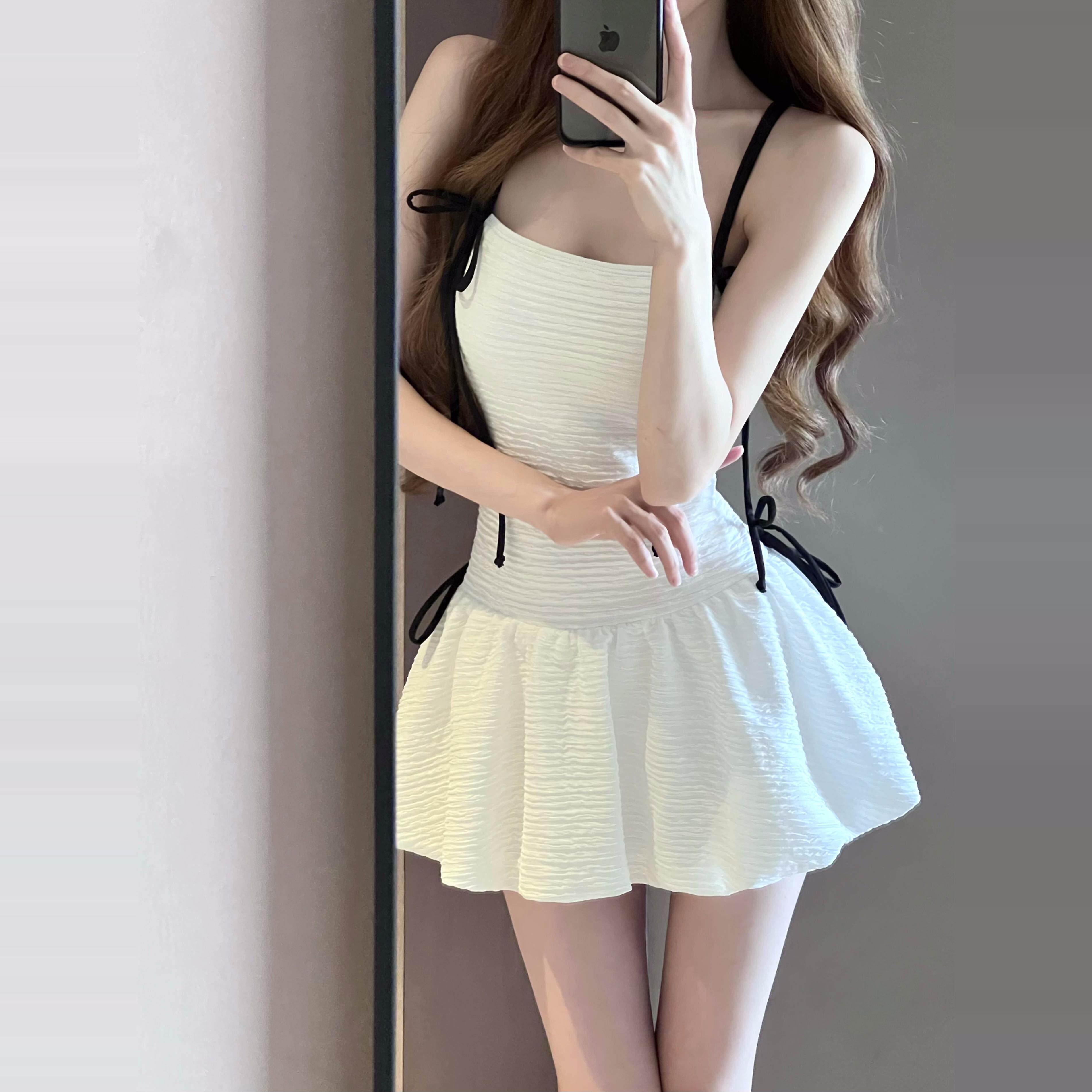 2025新款泳衣女连体裙式吊带蝴蝶结显瘦遮肚保守温泉度假甜美白色