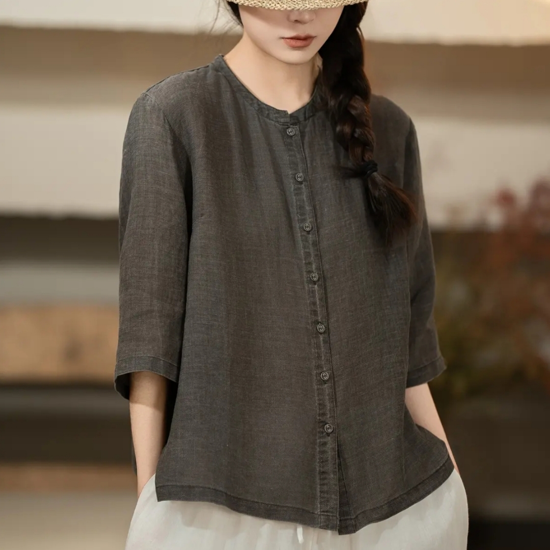 2025夏季新款色织小圆领斜纹苎麻小衫中袖宽松衬衫上衣