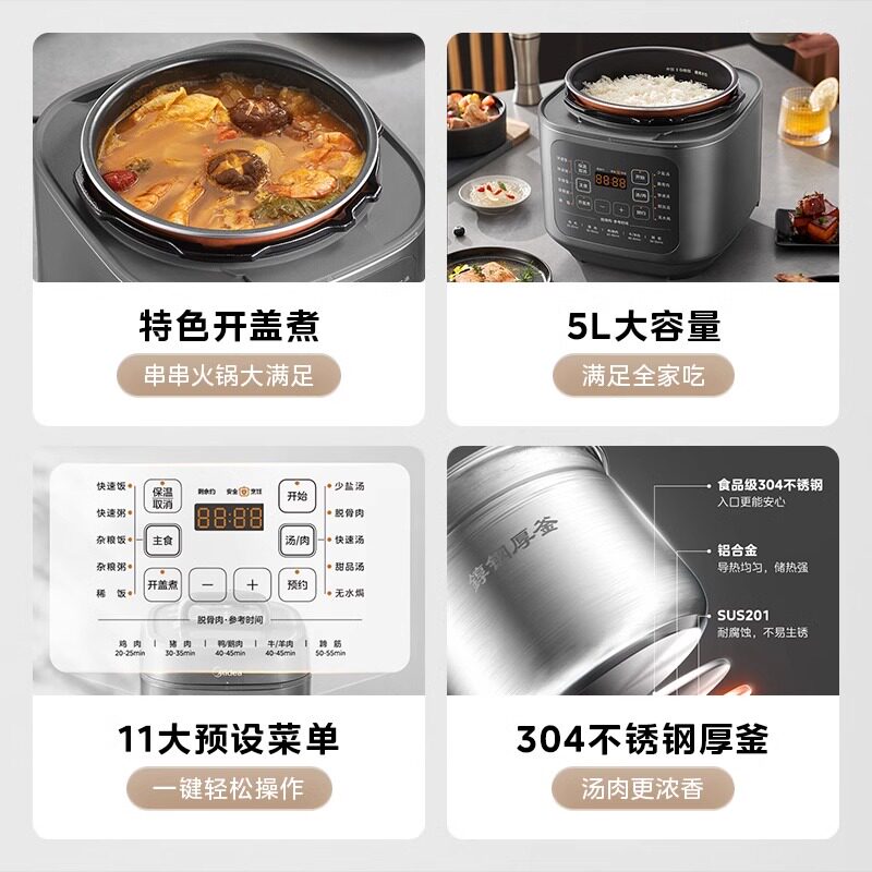 美的0涂层电压力锅5升家用高压锅不锈钢电饭煲