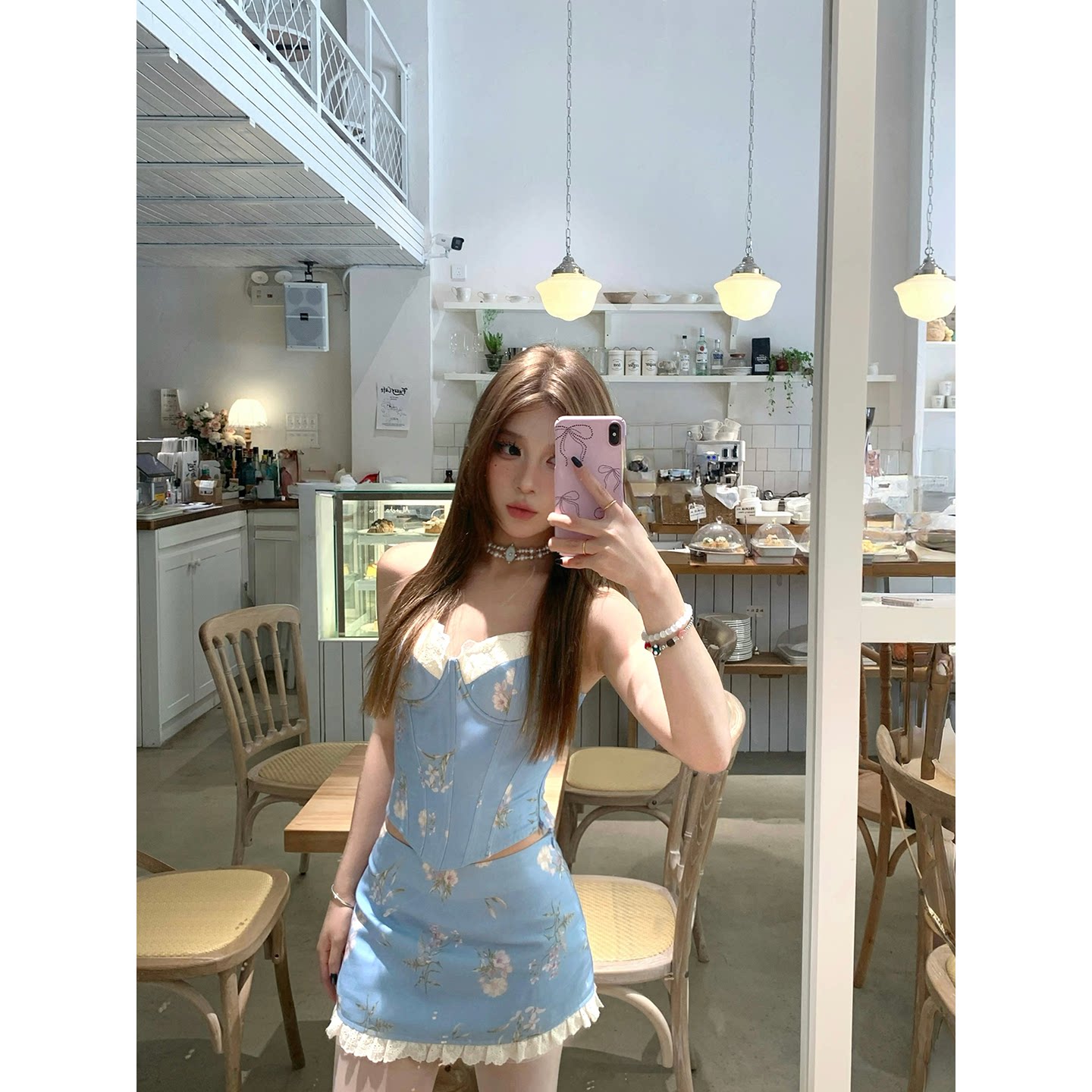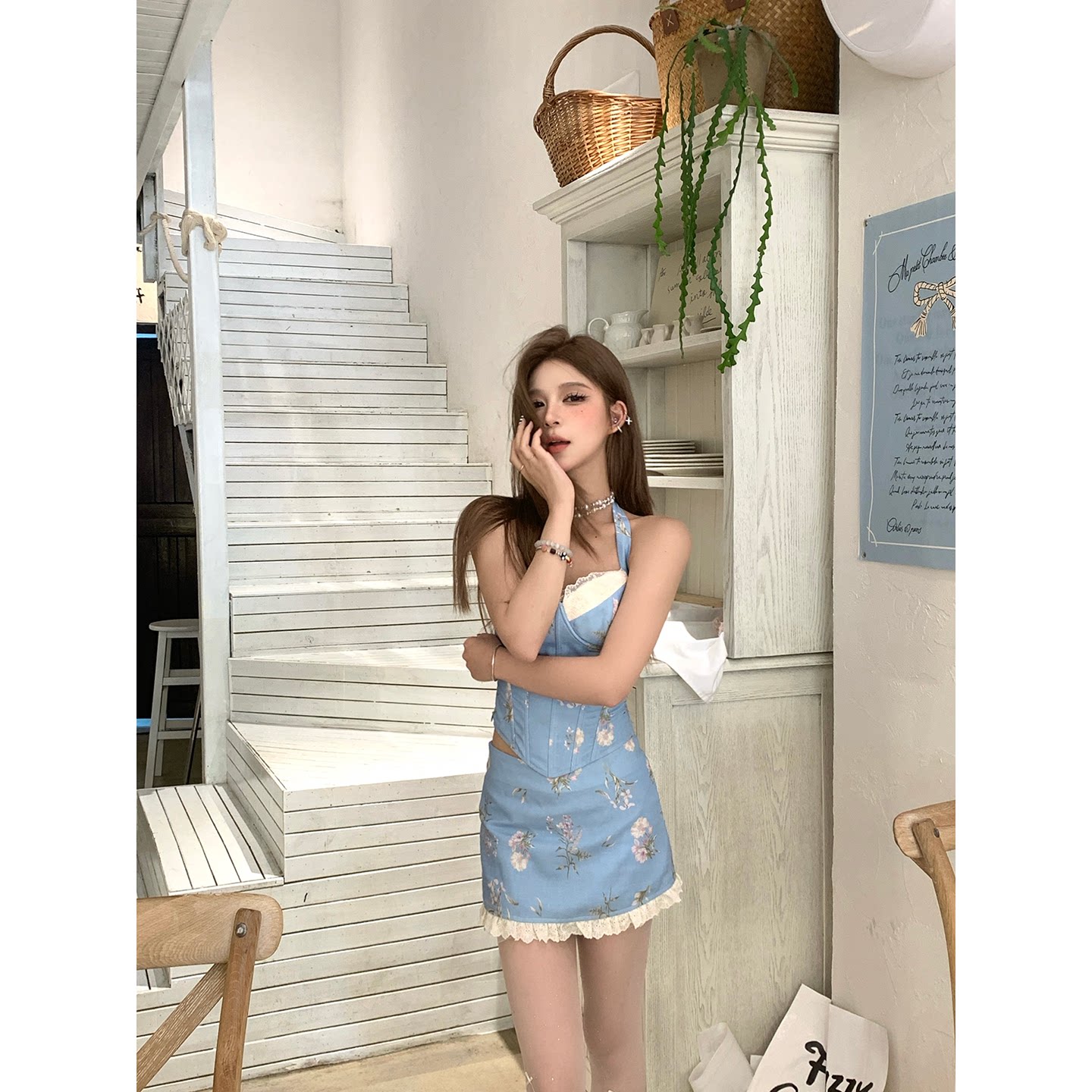 CAFE ROSE 芭蕾风时尚套装女夏季修身显瘦挂脖背心包臀短裙两件套