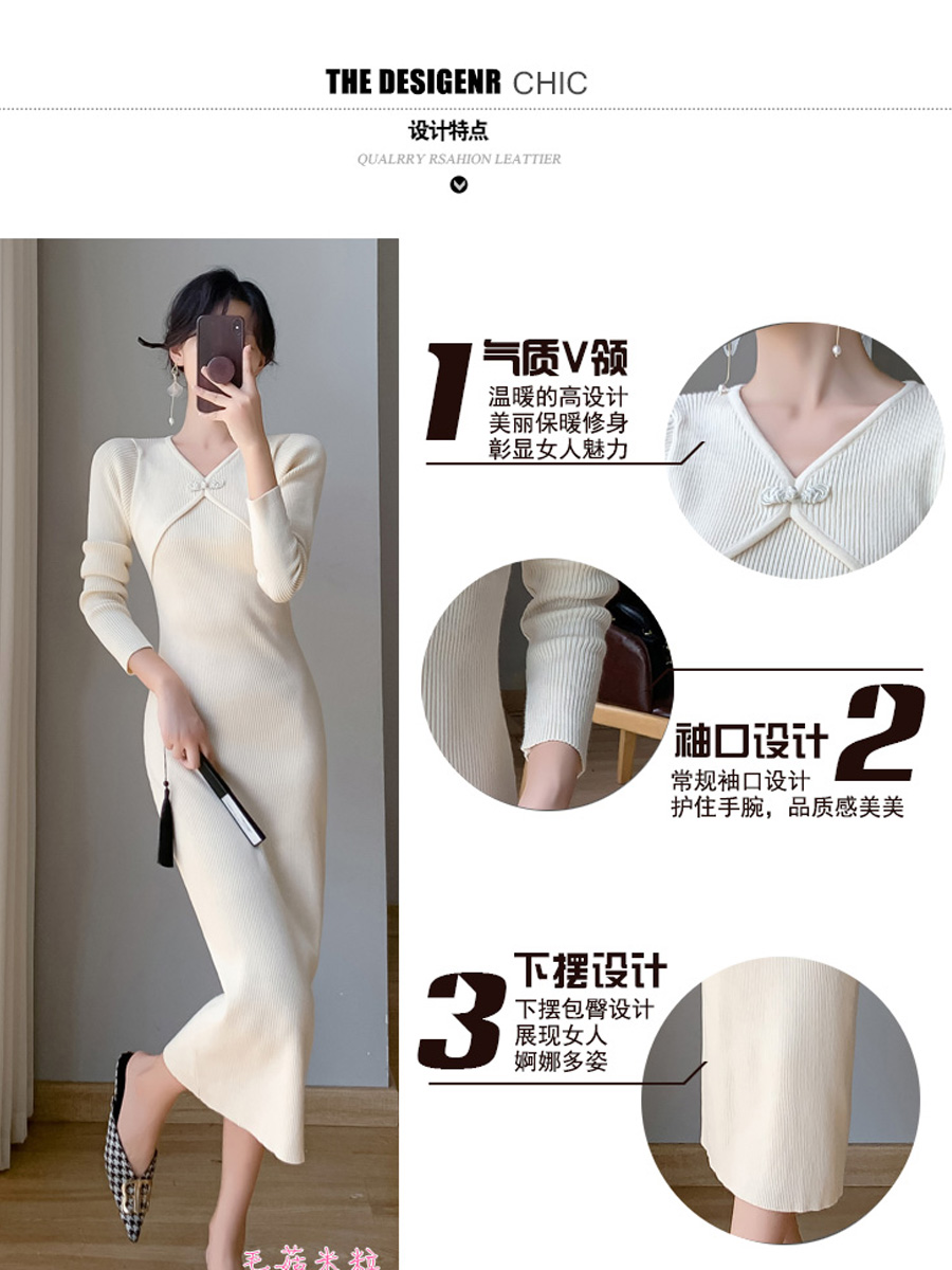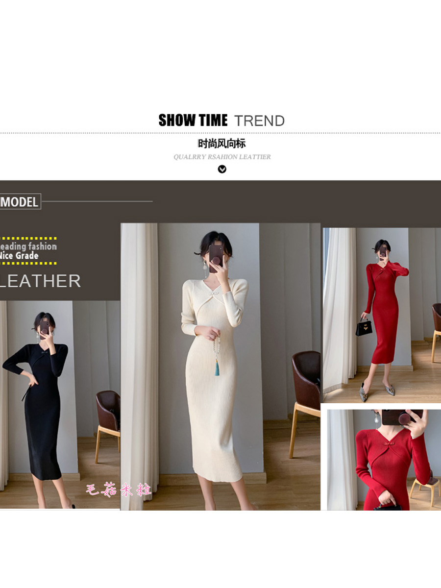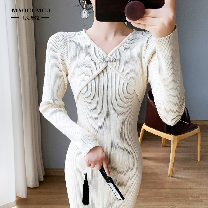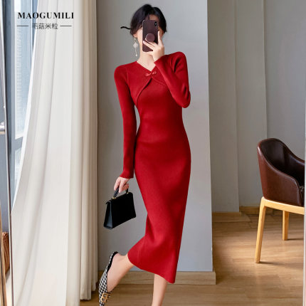 针织连衣裙女秋冬新中式复古盘扣旗袍年轻款高端气质打底毛衣裙子