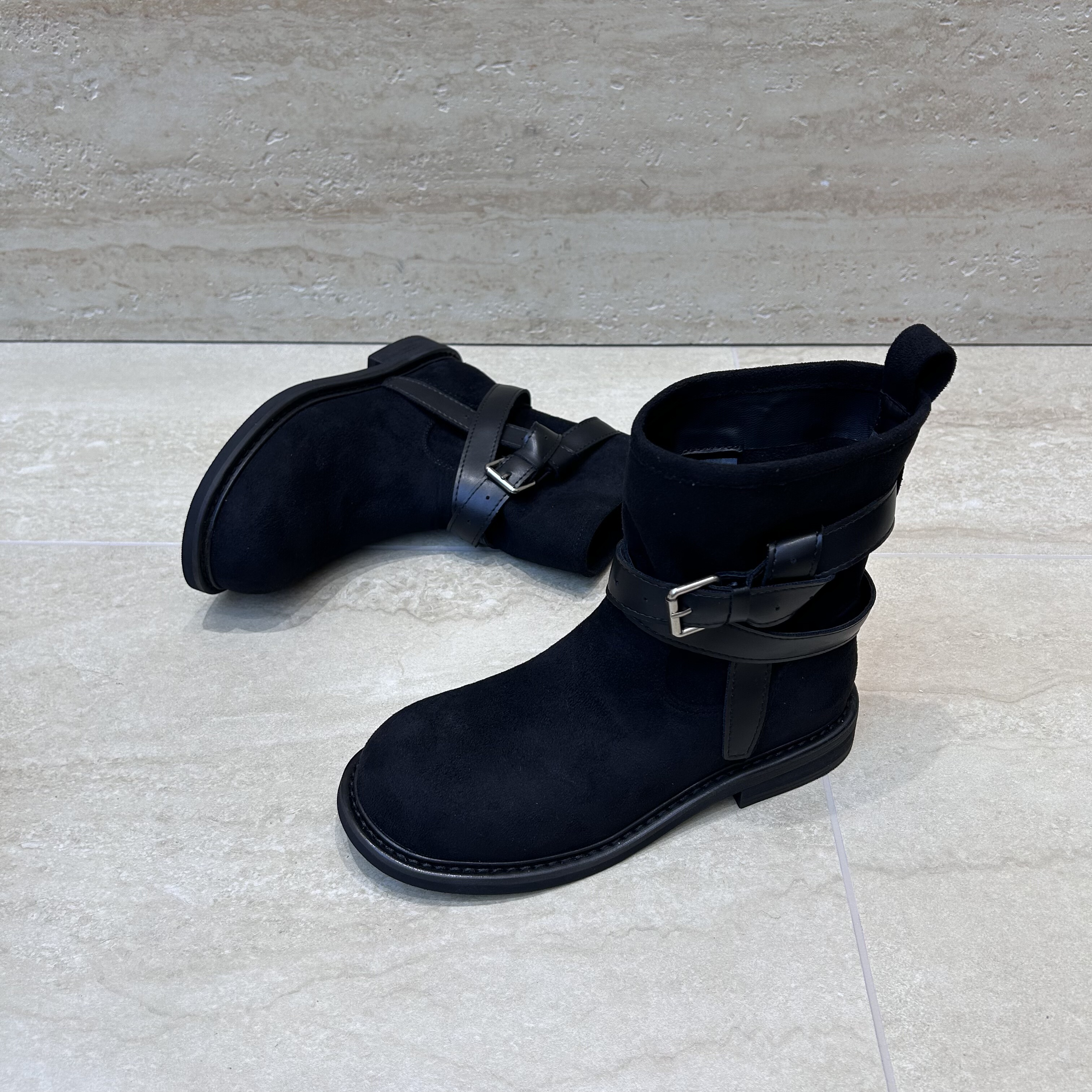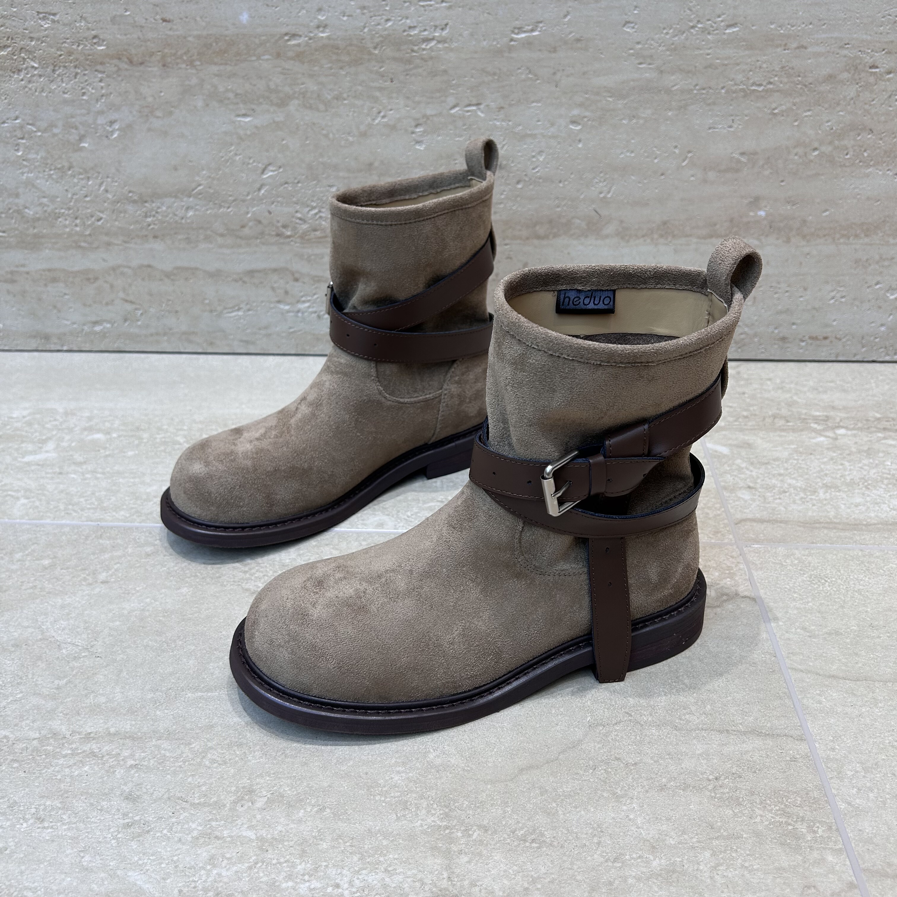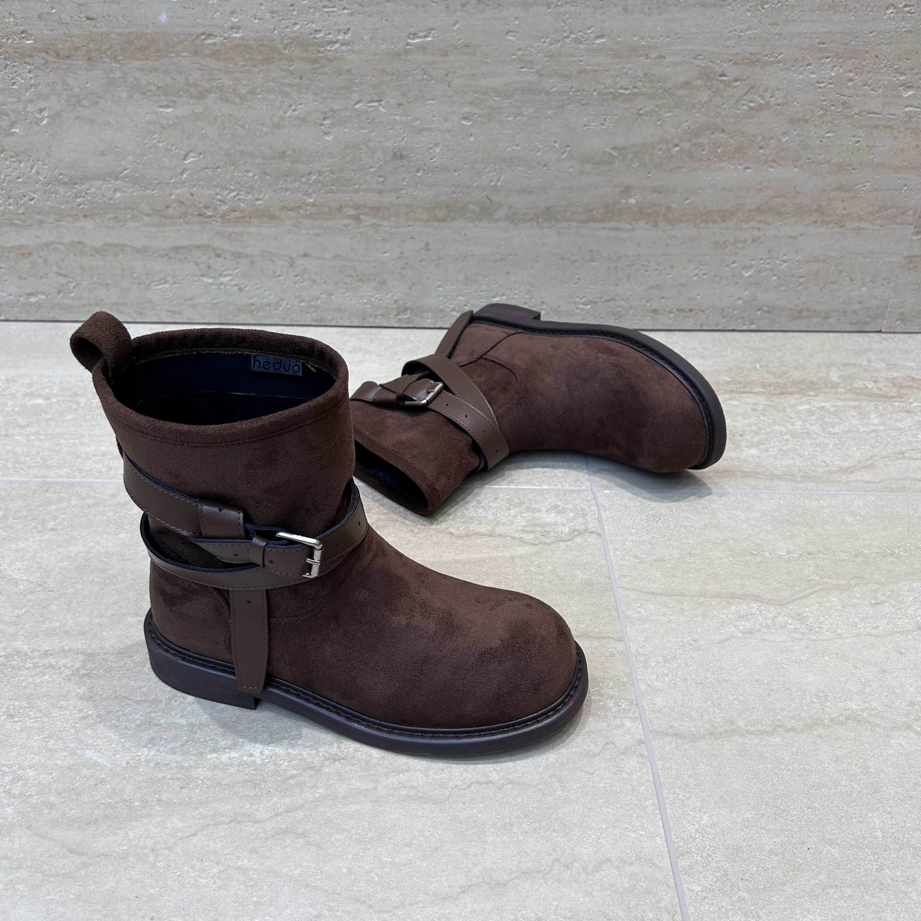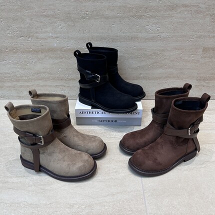 2025新款秋季皮带扣弹力布绒方跟时尚百搭休闲舒适女马丁靴套筒款