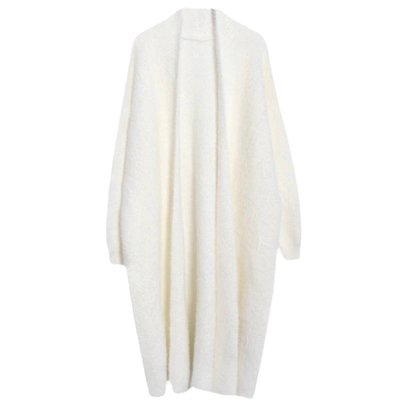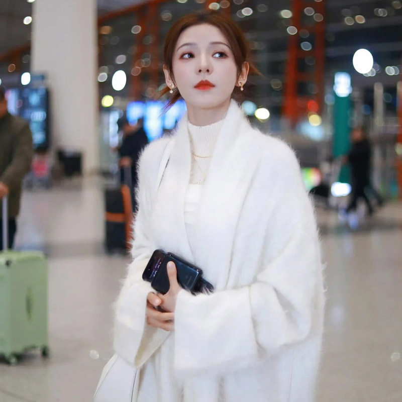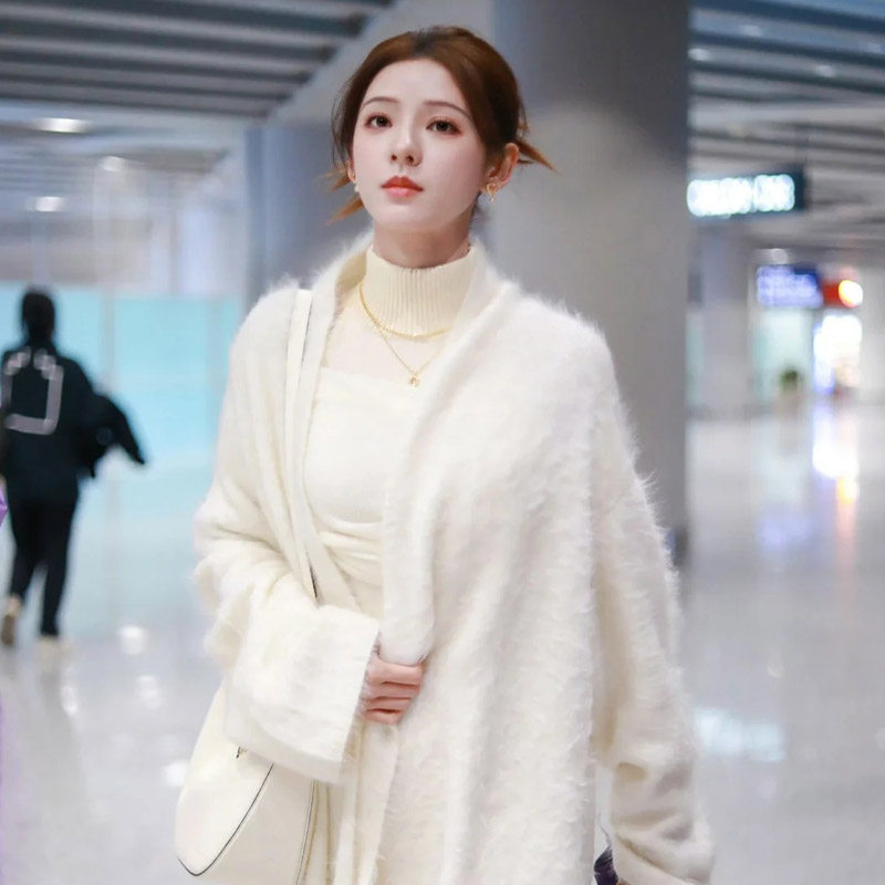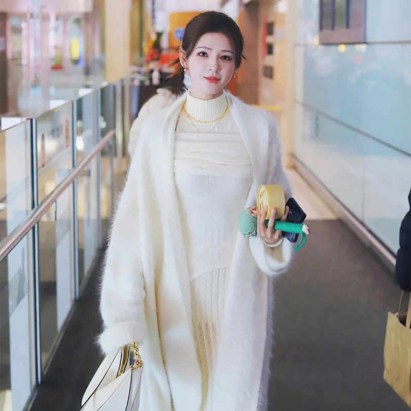 张予曦同款慵懒风白色水貂绒针织开衫女秋冬款中长款气质毛衣外套