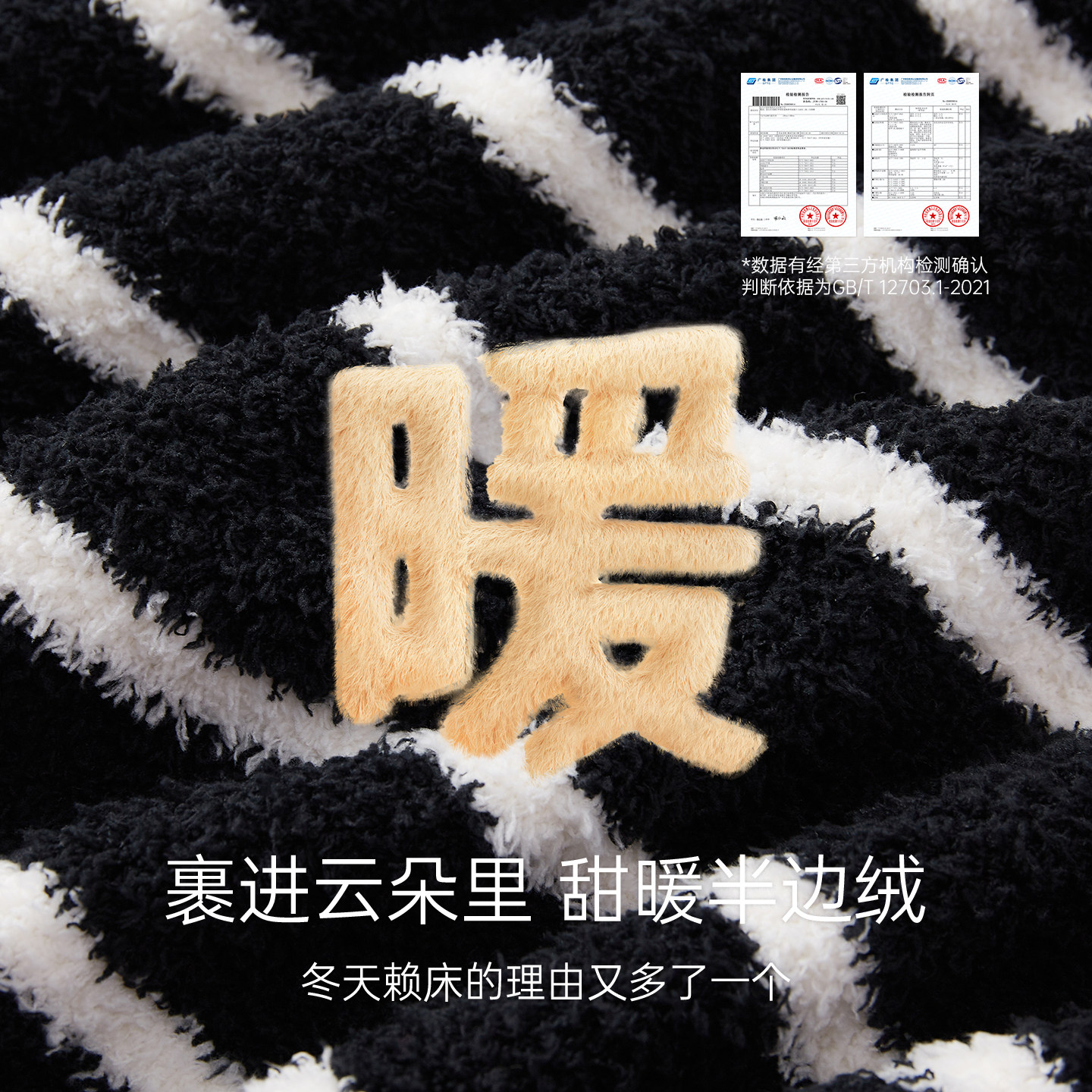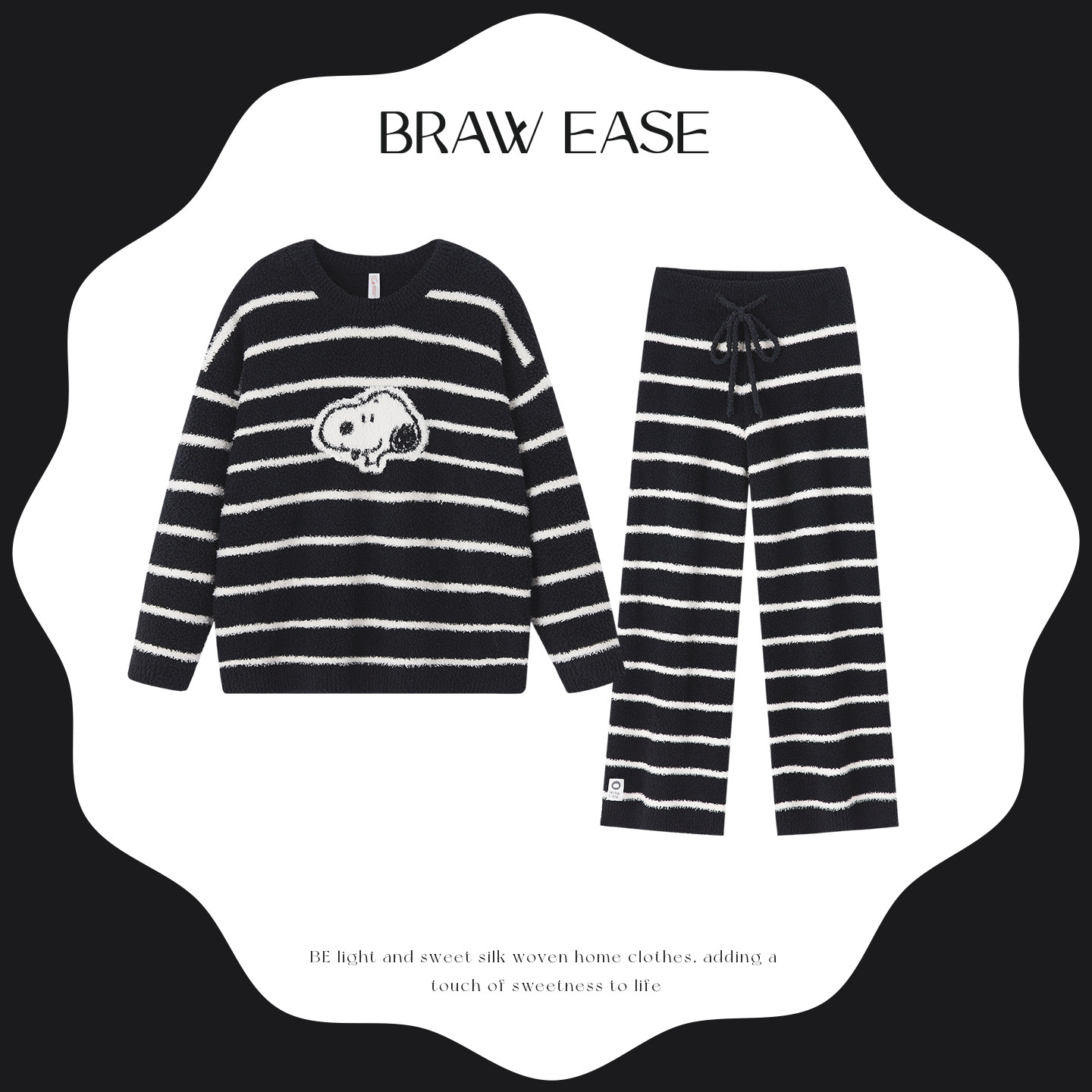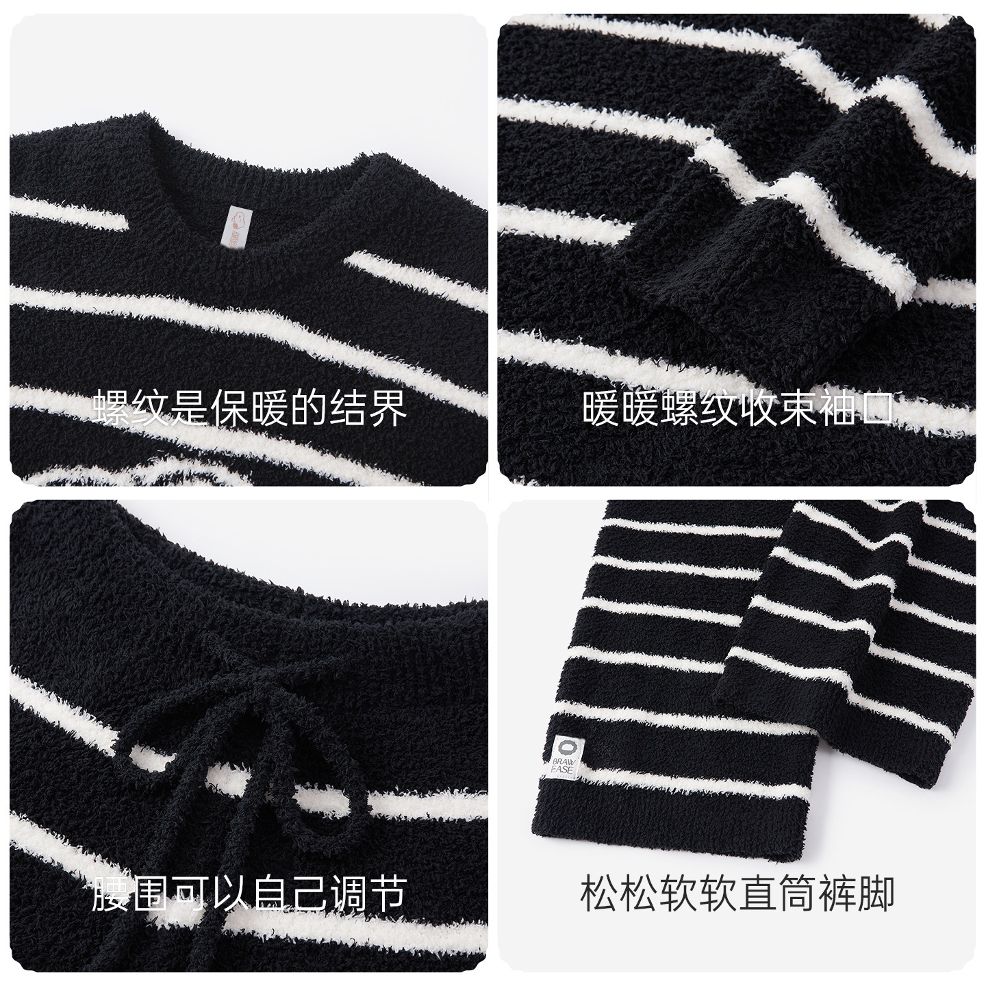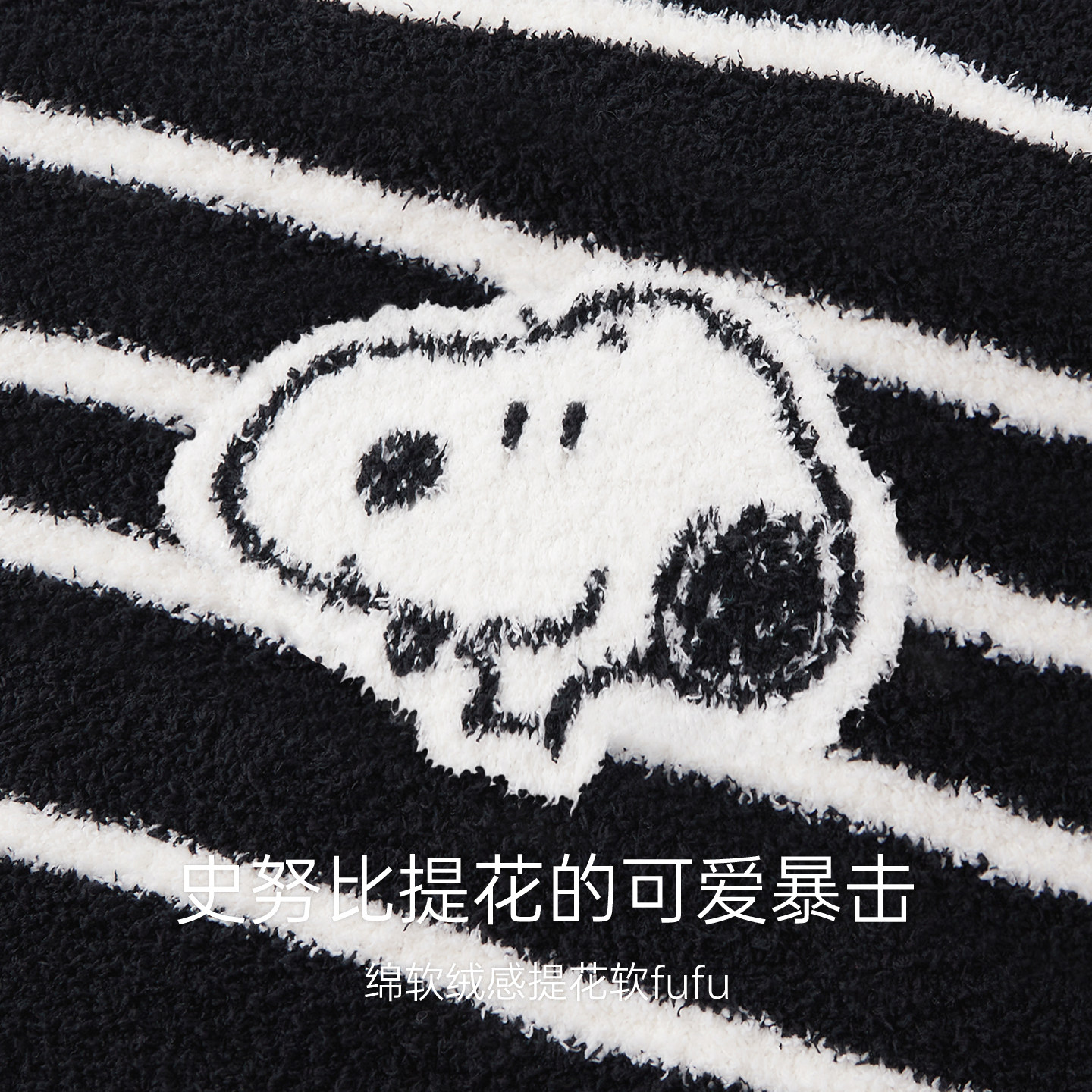 史努比半边绒睡衣女款黑色条纹冬季长袖珊瑚绒加绒加厚秋冬家居服