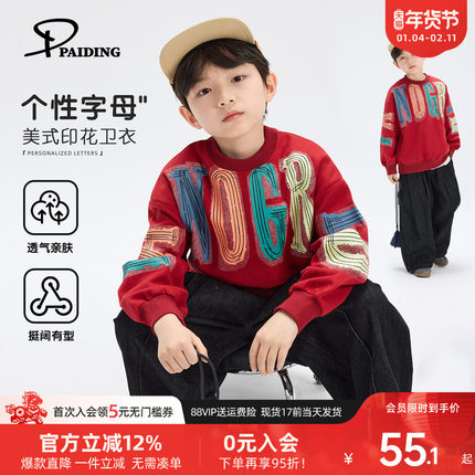 派町童装男童红色卫衣2026新款春装儿童套头上衣大童休闲帅气外套