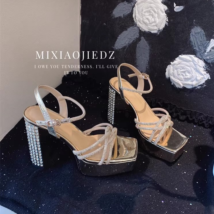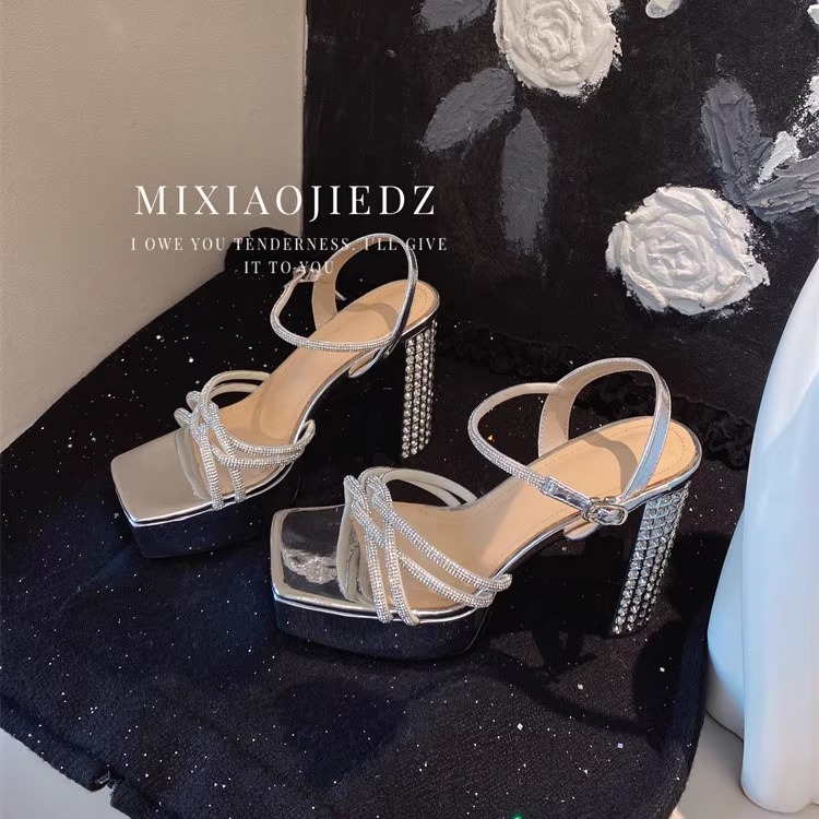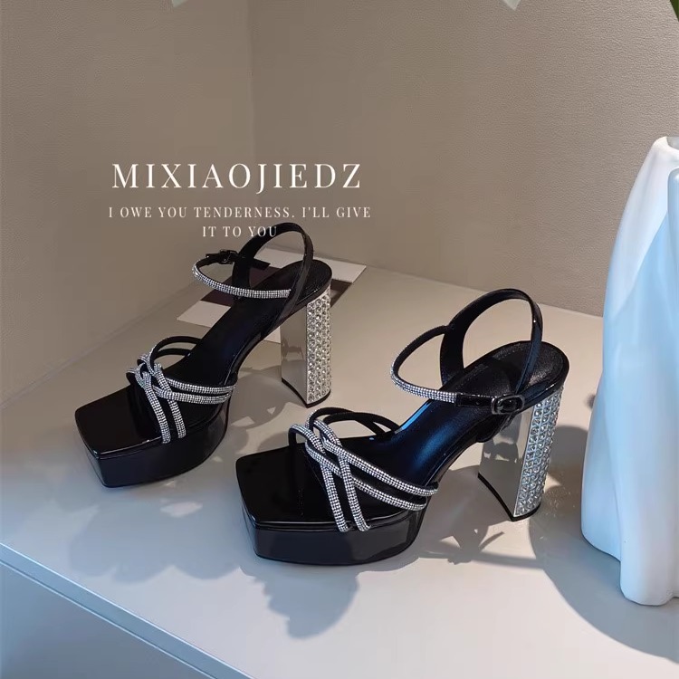 轻奢重工2025新款爆款凉鞋女夏季真皮水钻粗跟防水台一字带女鞋