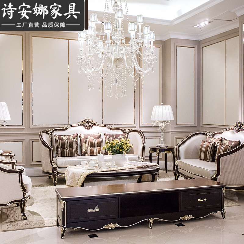 新古典客厅家具 实木手工雕花香槟银实木沙发 皮艺沙发组合