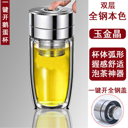玉金晶全钢鹅蛋杯双层玻璃杯男女士高档水杯便携杯子按压滤网茶杯