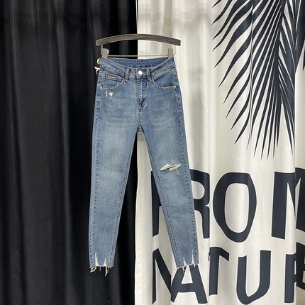 2025春季新款蓝色辣妹牛仔裤女高腰紧身显瘦显高小脚破洞九分裤潮