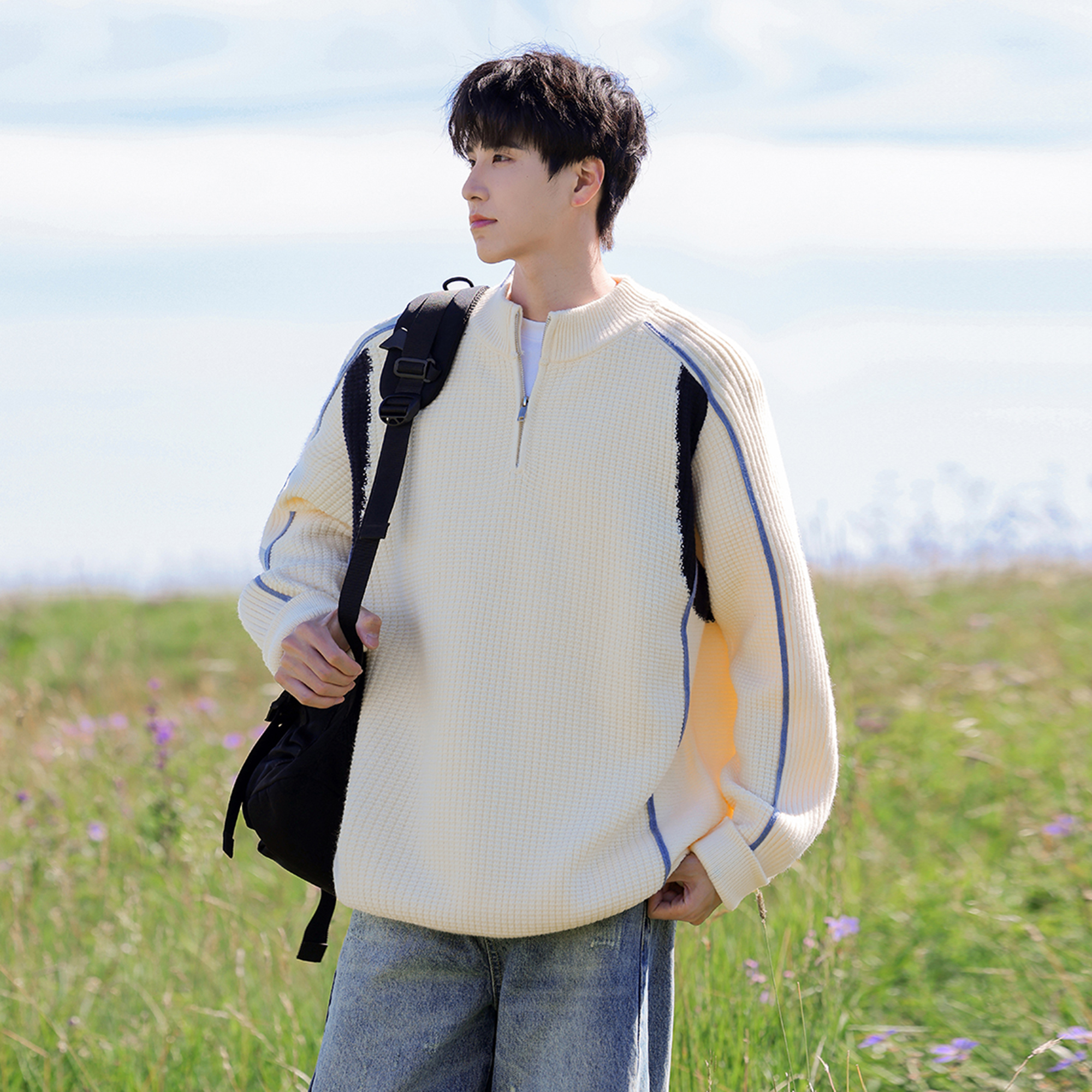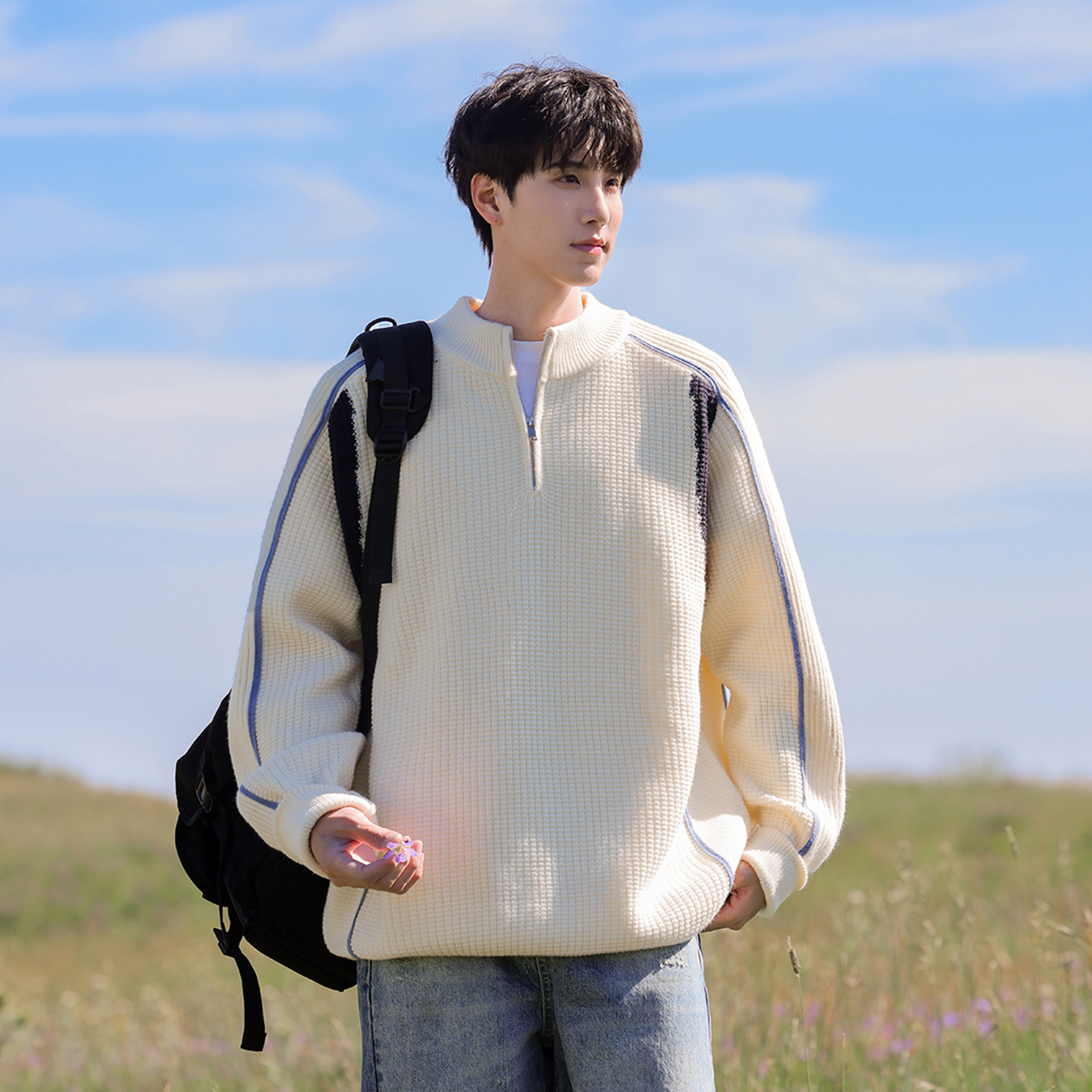 胖胖哥美式半拉链撞色针织毛衣男秋季大码宽松拼接复古休闲外套潮