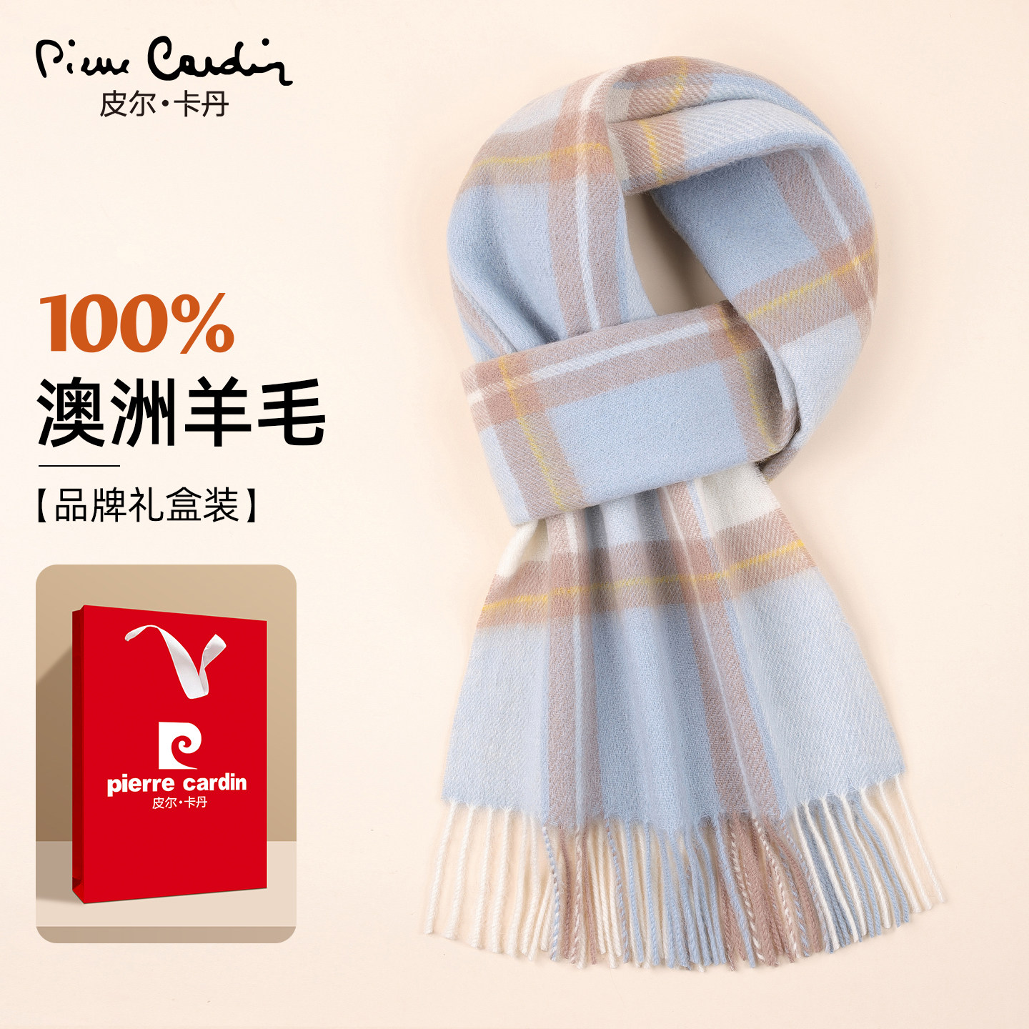 皮尔卡丹100%绵羊毛围巾女士冬季新款高端格子新年红色围巾女款冬