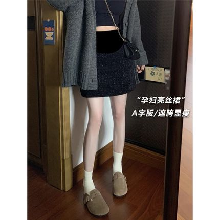 孕妇半身裙秋冬黑色亮丝a字短裙高腰托腹显瘦Q一步裙加厚包臀裙子