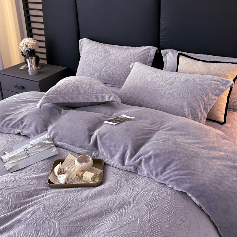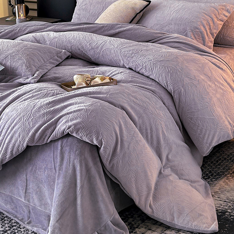 紫色雕花牛奶绒冬季床上四件套轻奢高级感珊瑚绒床单被套2025新款