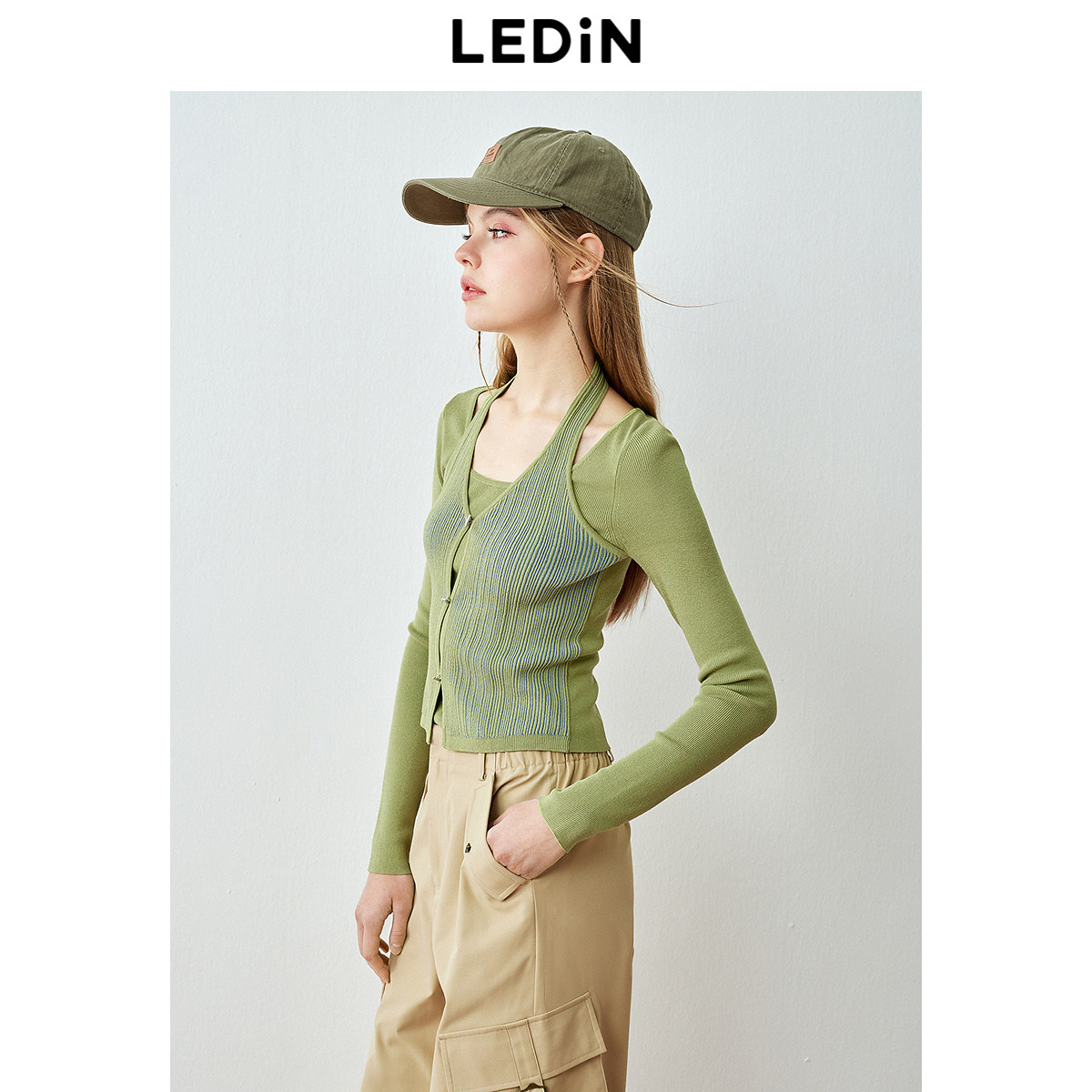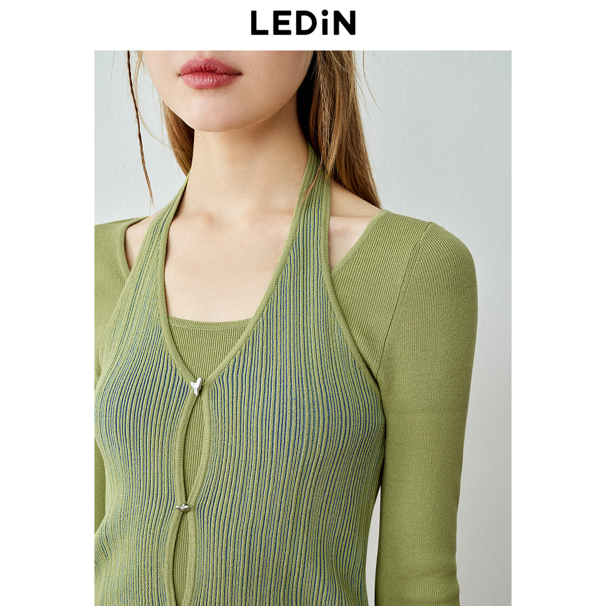 乐町假两件挂脖针织上衣春季新款假门襟干爽冰丝方领针织衫