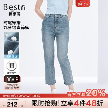 百斯盾女装牛仔裤2025年夏季新款后松紧腰棉软质感九分铅直筒女裤