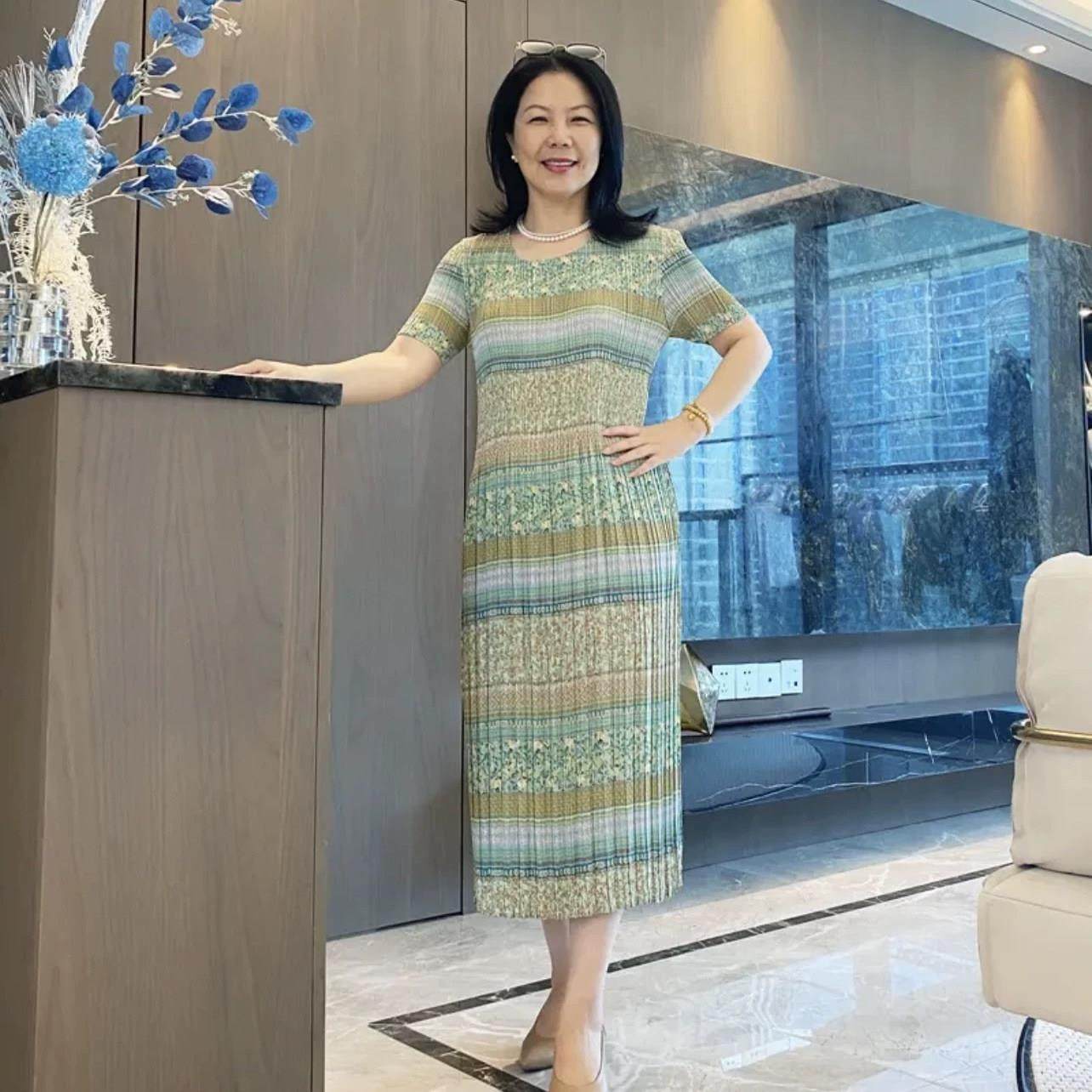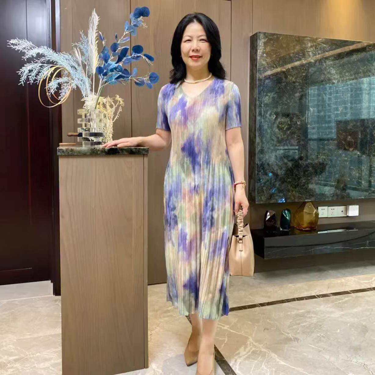 夏季连衣裙短袖褶皱真丝印花气质新中式大码显瘦减龄妈妈中长裙