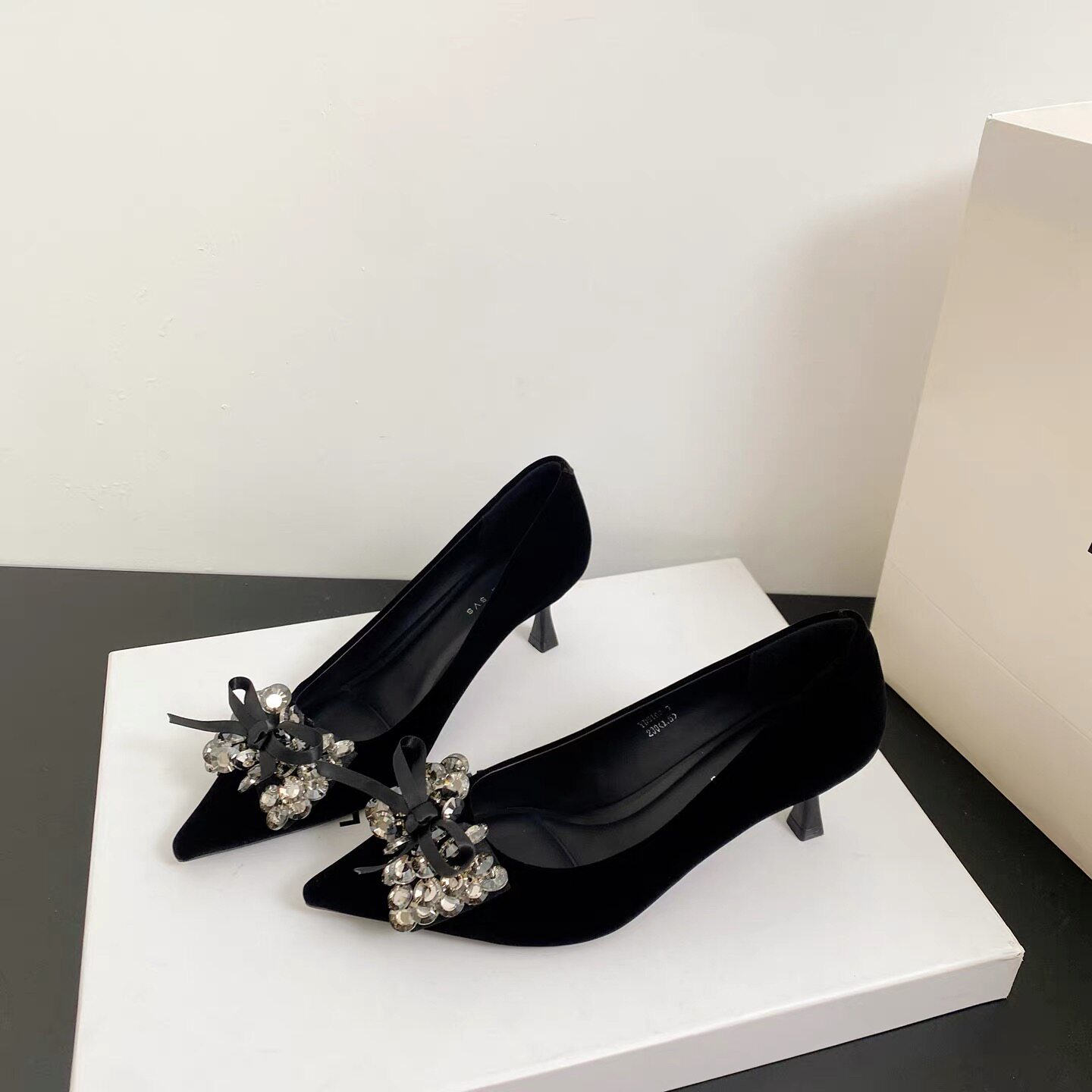 米诗思黑色尖头浅口单鞋女水钻蝴蝶结细跟高跟鞋气质通勤鞋子