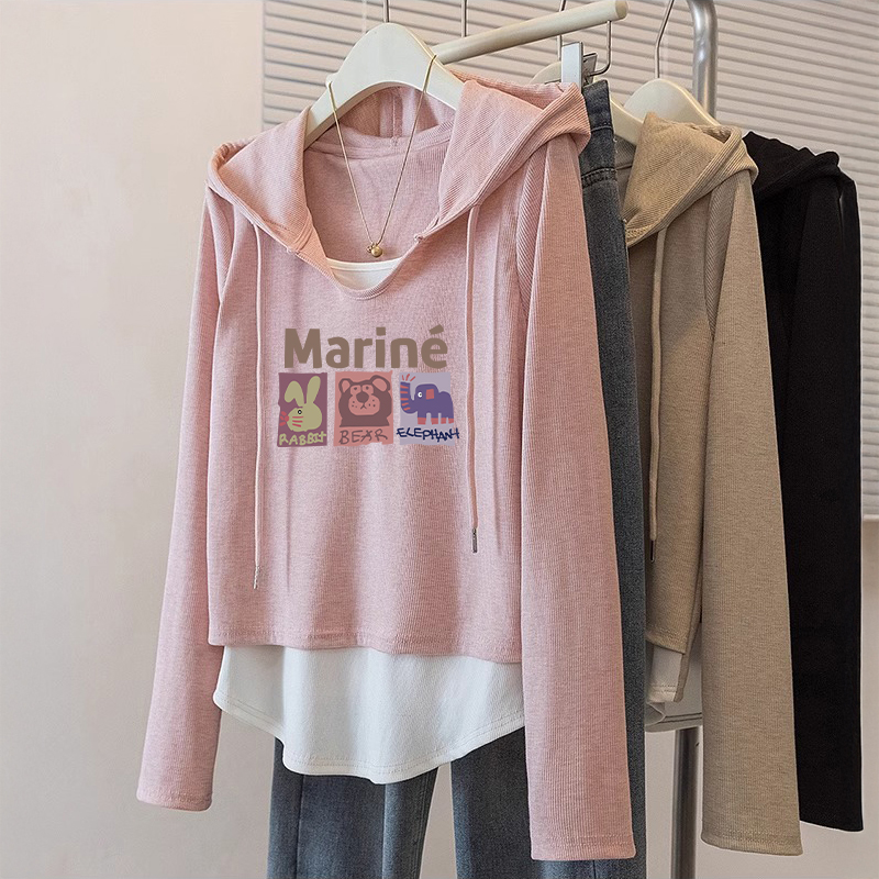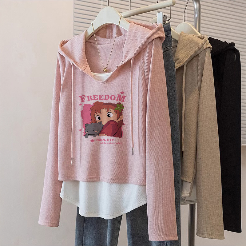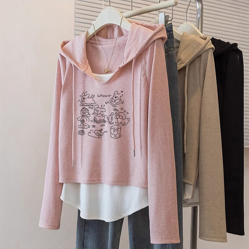 粉色宽松假两件长袖上衣