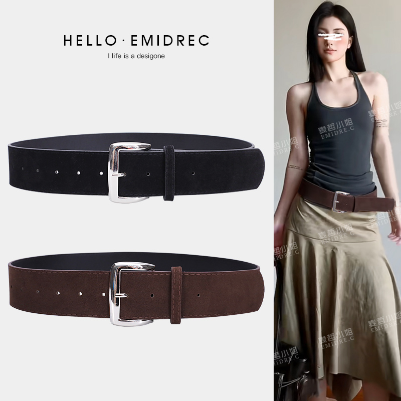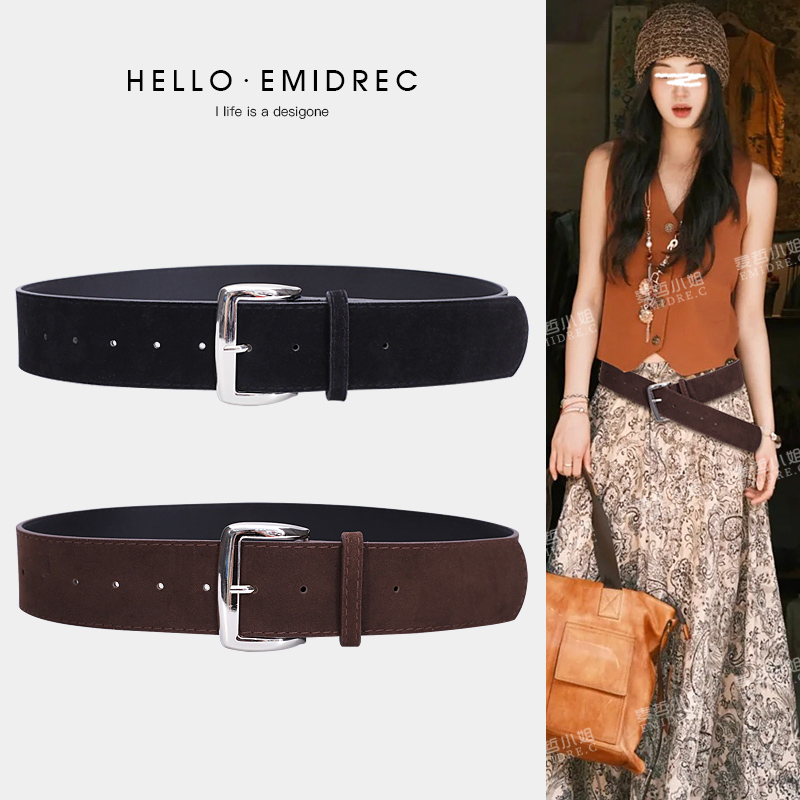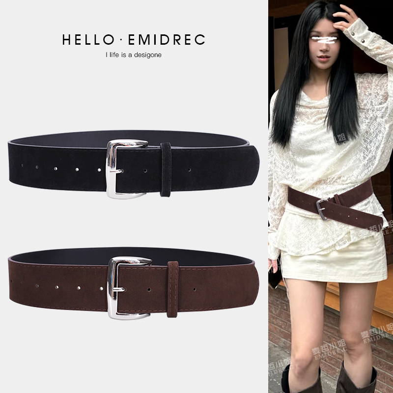 复古宽腰带配饰女腰封粗皮带装饰配裙子毛衣黑色咖色麂皮绒面磨砂