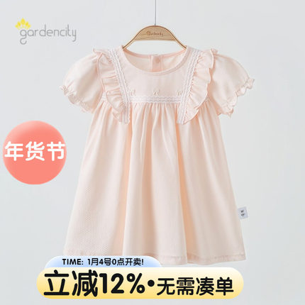 婴儿短袖连衣裙夏季薄款珍珠提花弹力棉女宝宝甜美花边拼接公主裙