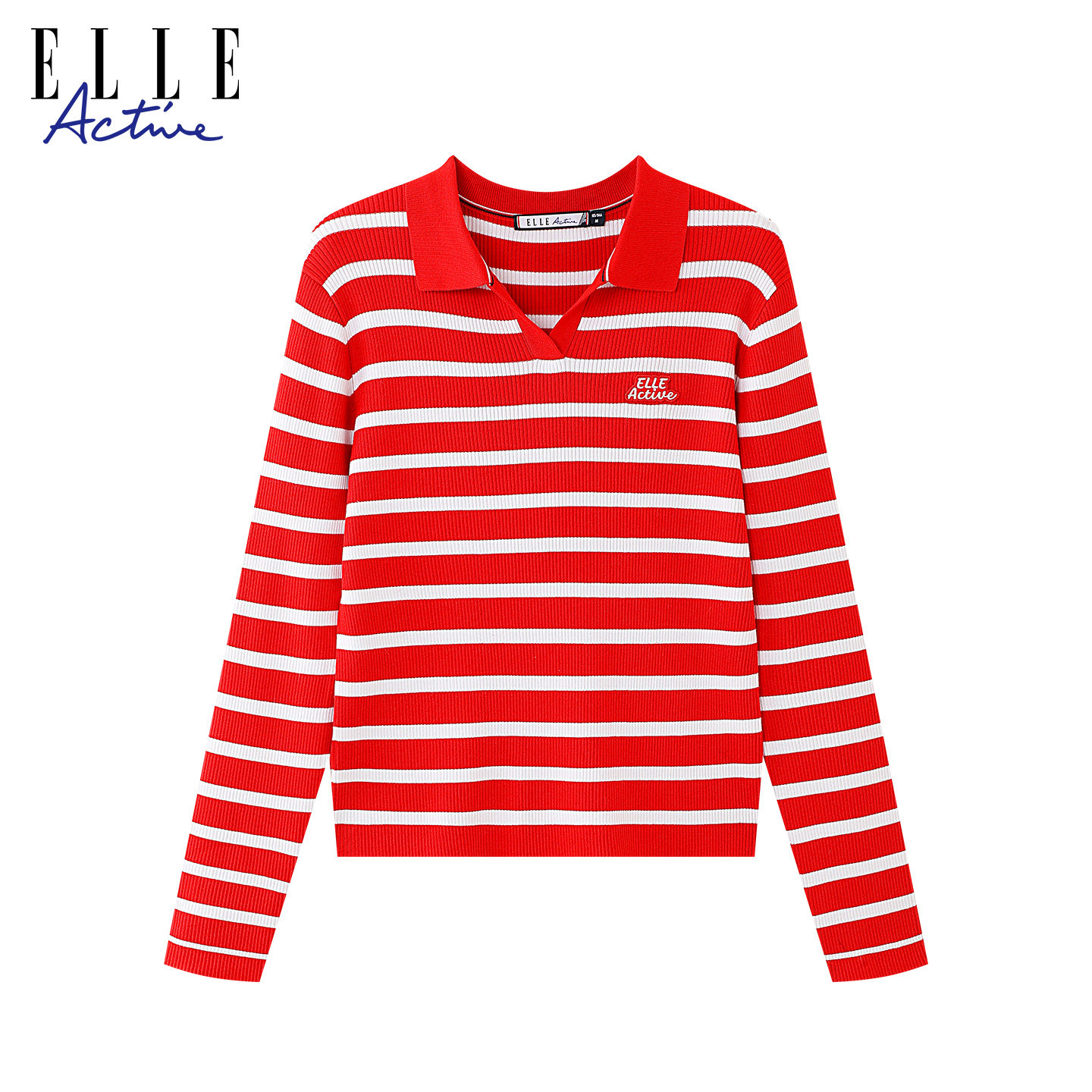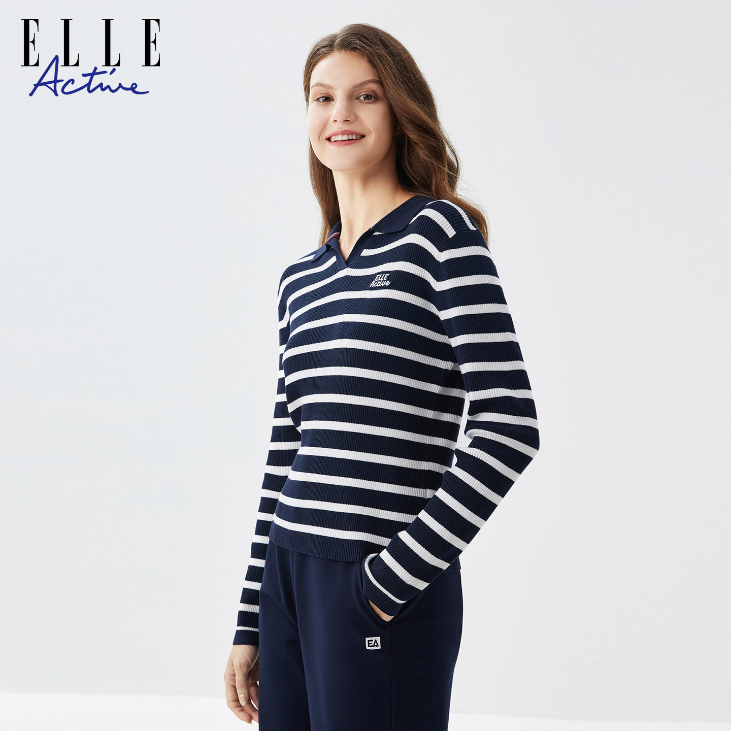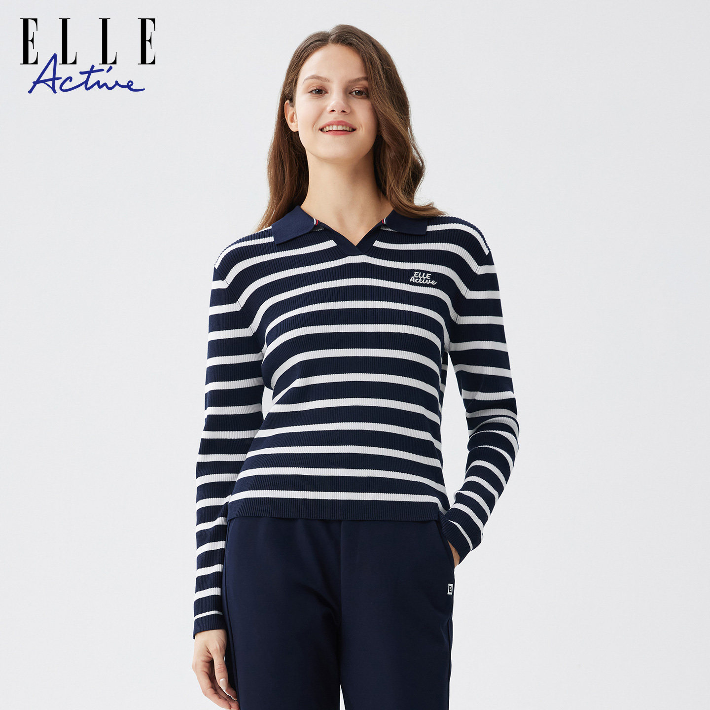 ELLE Active航海系穿搭针织衫显瘦V领上衣经典简约条纹polo领长袖
