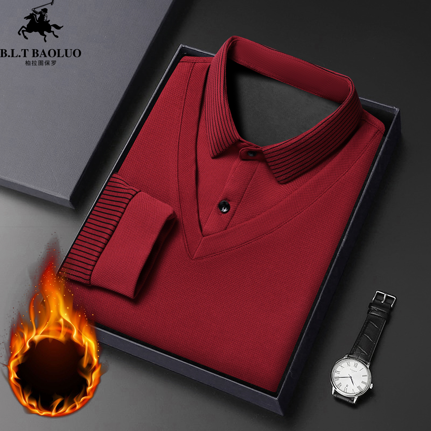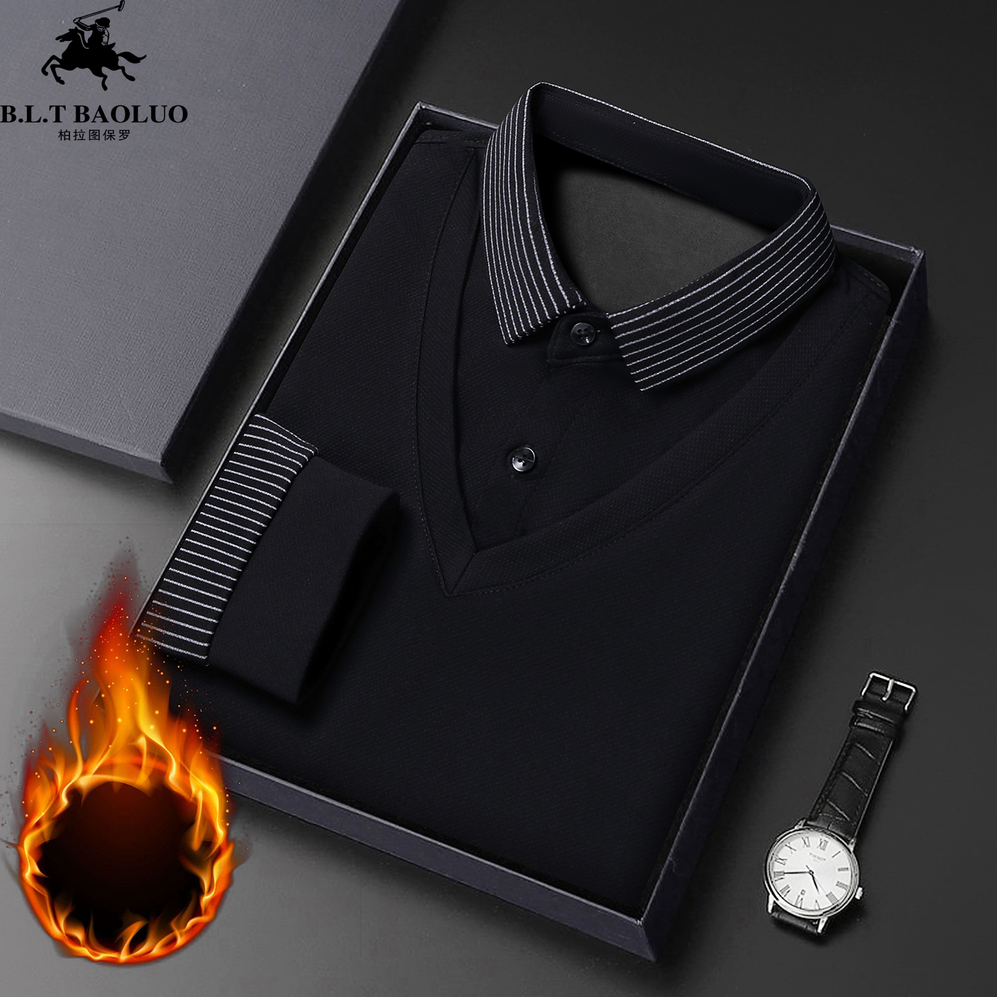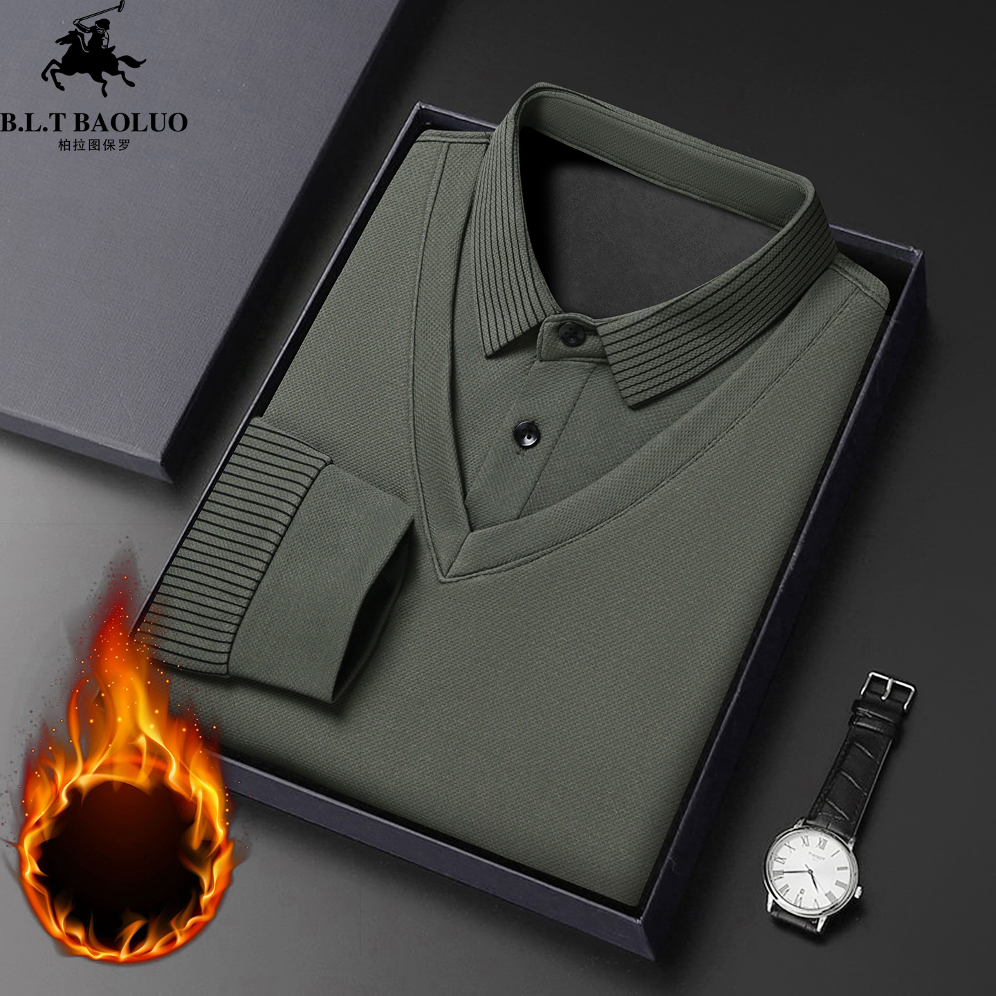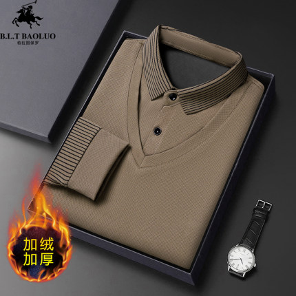 保罗男士长袖t恤假两件针织衫2025新款加绒加厚冬季中年保暖上衣