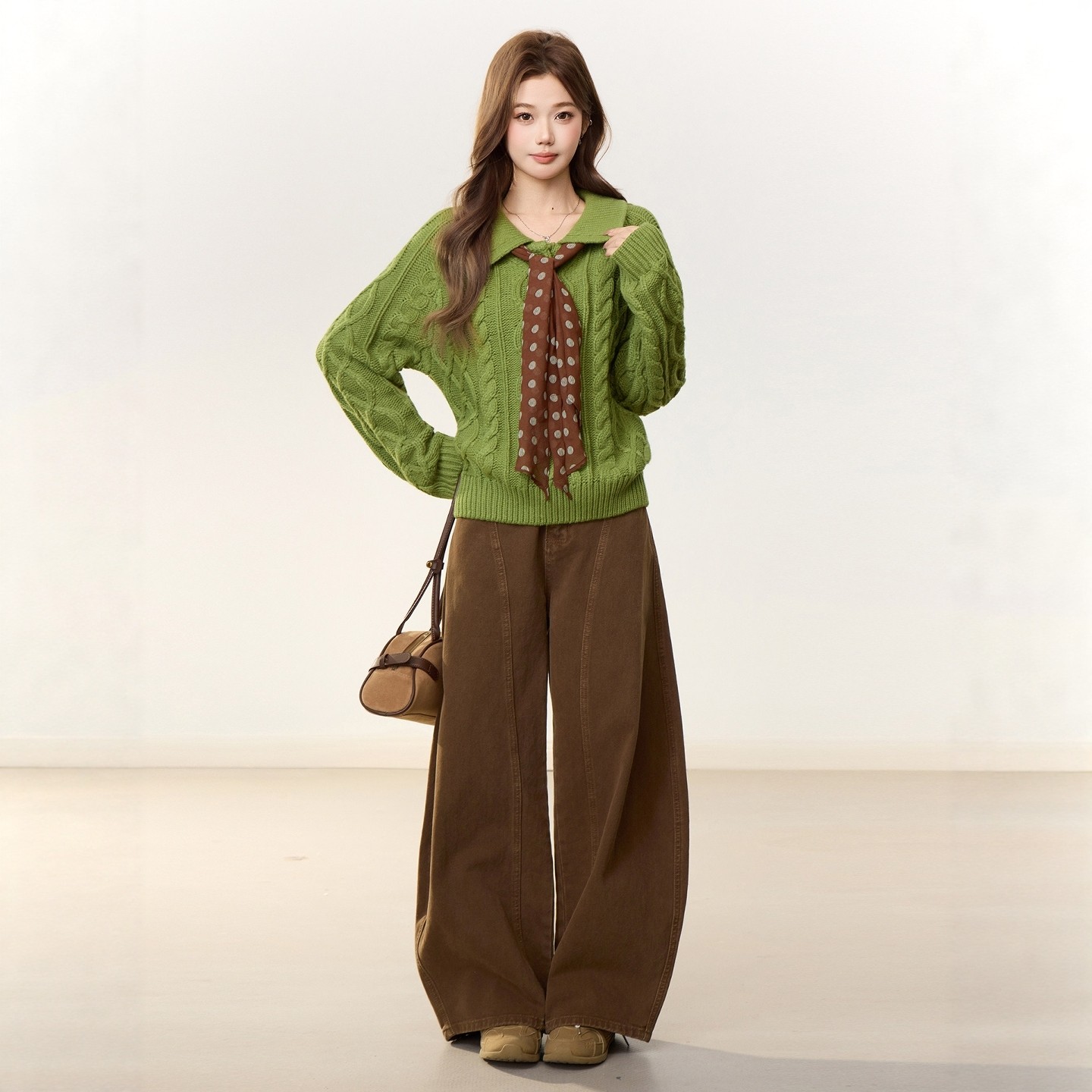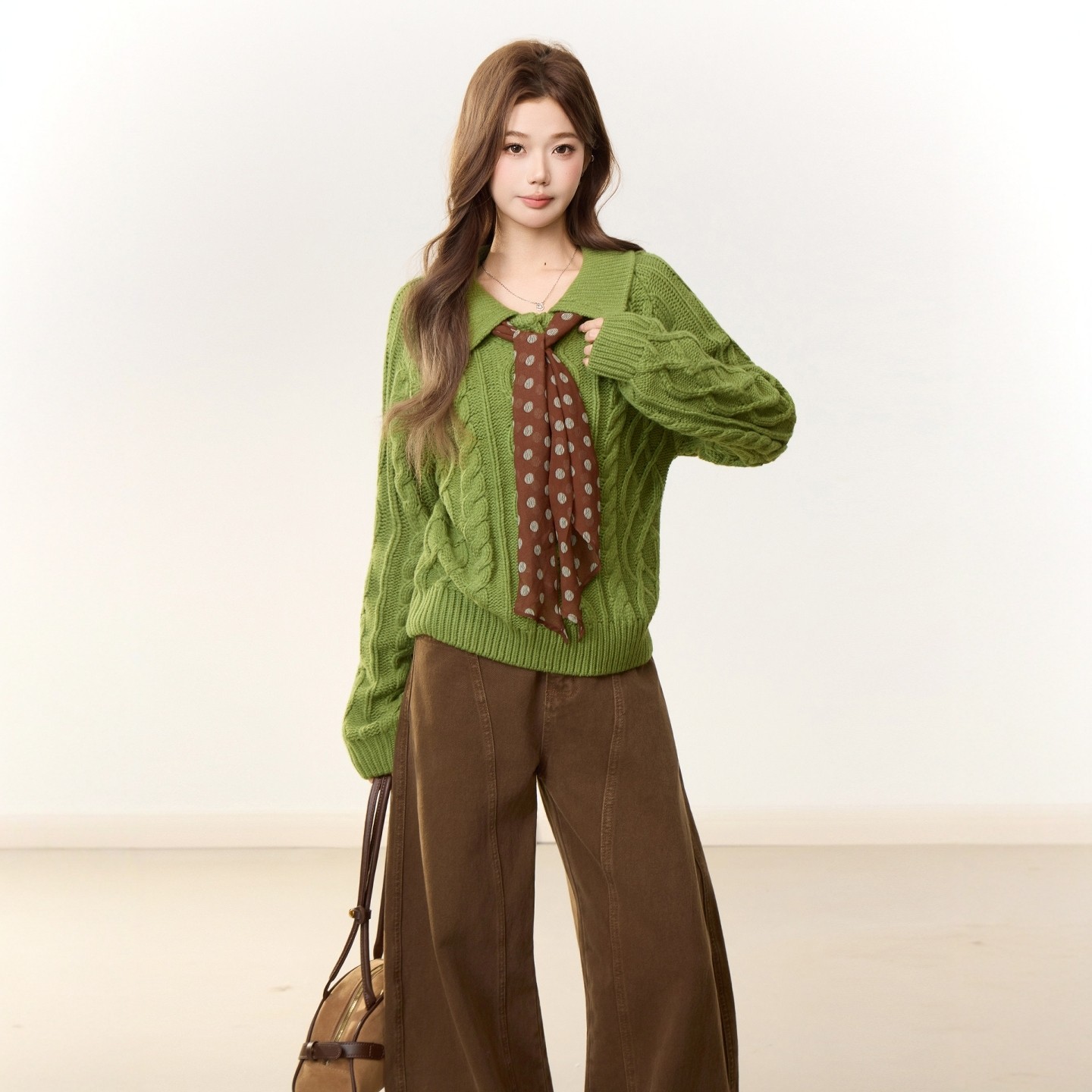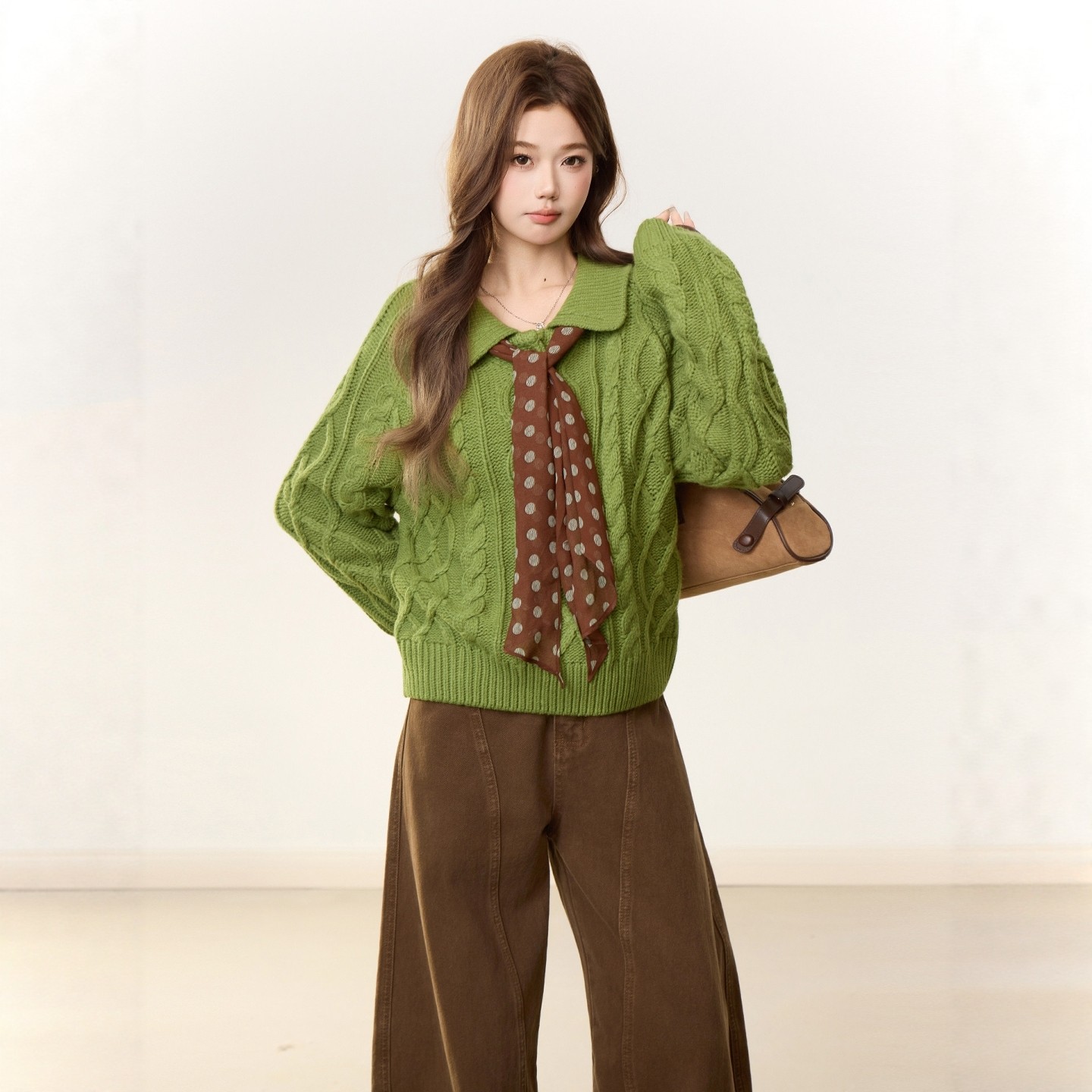 绿色毛衣套装慵懒风高级感套头外穿针织衫翻领内搭圣诞上衣女冬季