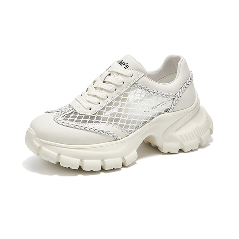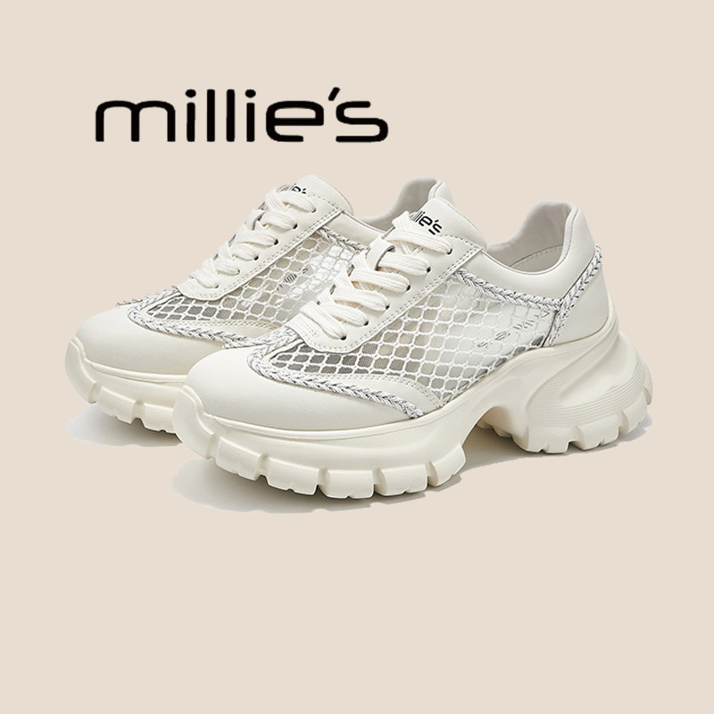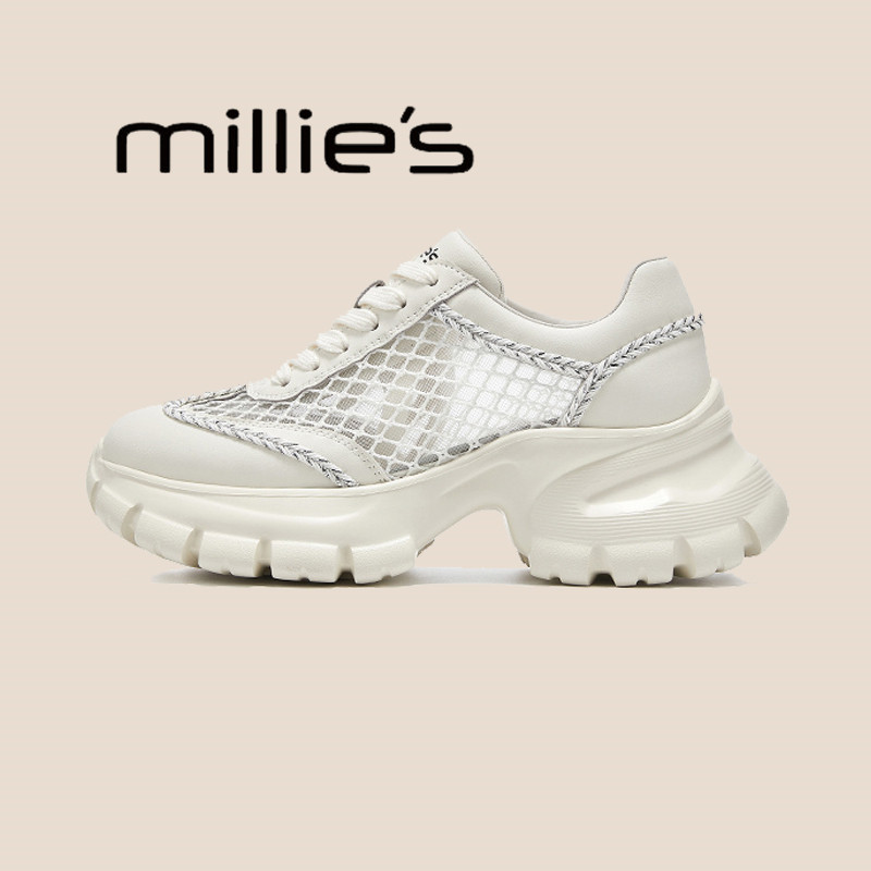 MILLIE'S/妙丽真皮厚底白色镂空凉鞋女款牛皮透气休闲运动老爹鞋