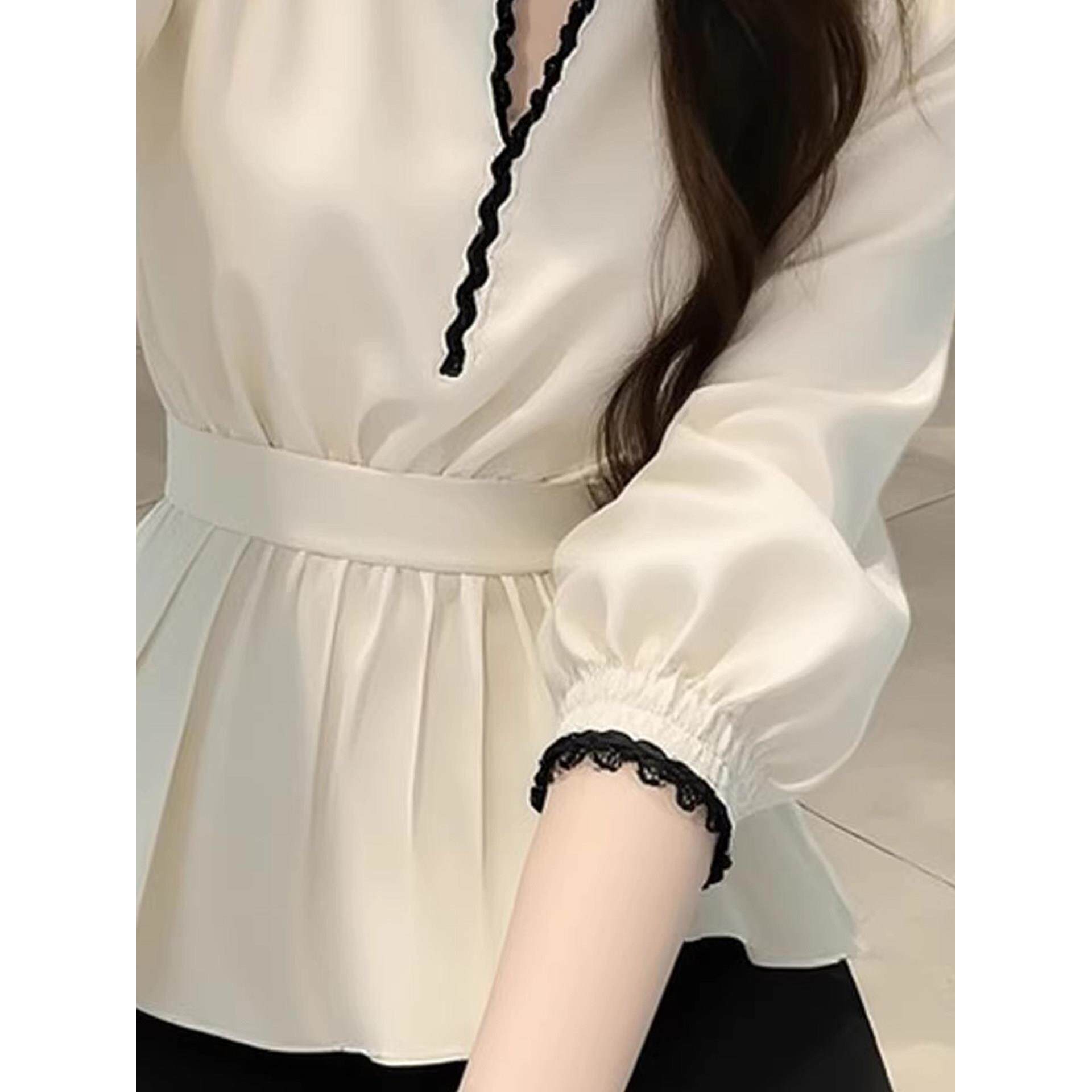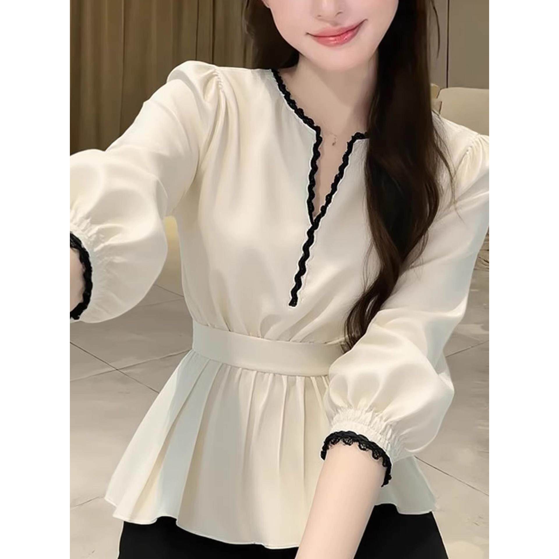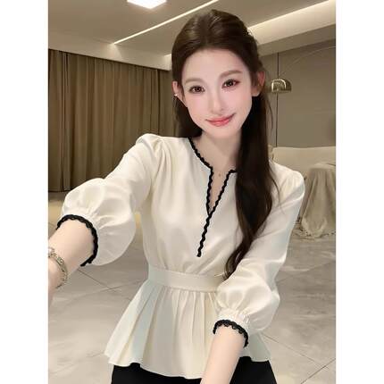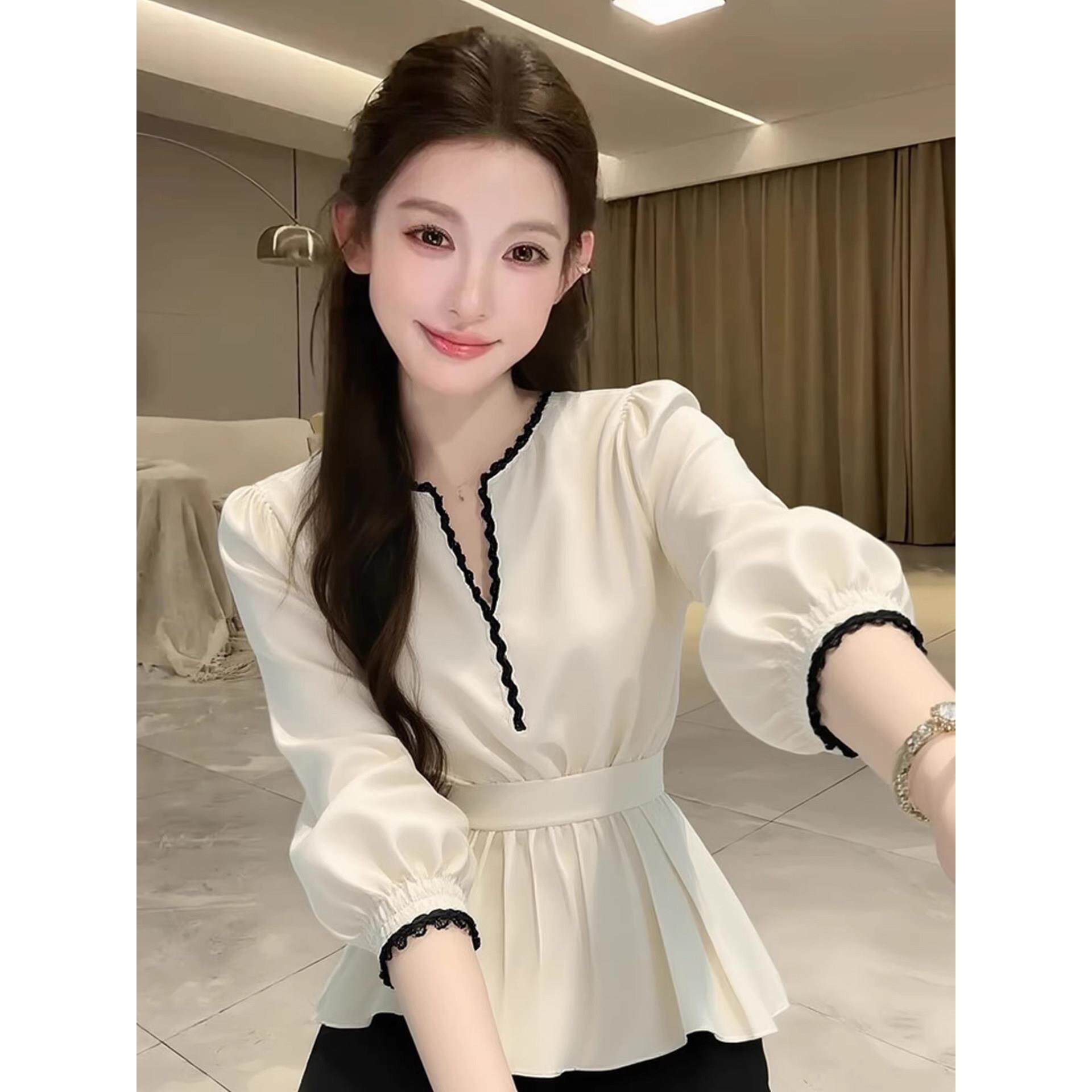 韩系氛围感绝美白色v领长袖收腰衬衫女春季新款简约百搭独特衬衣
