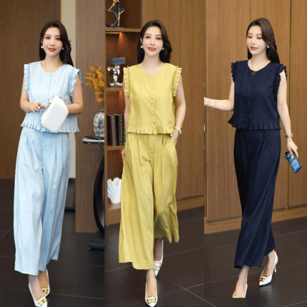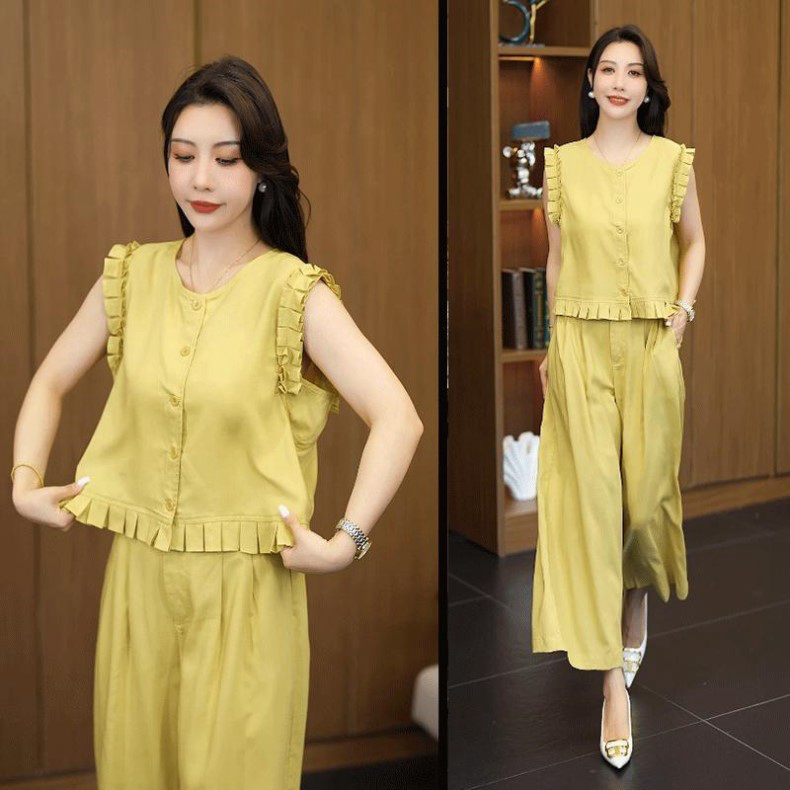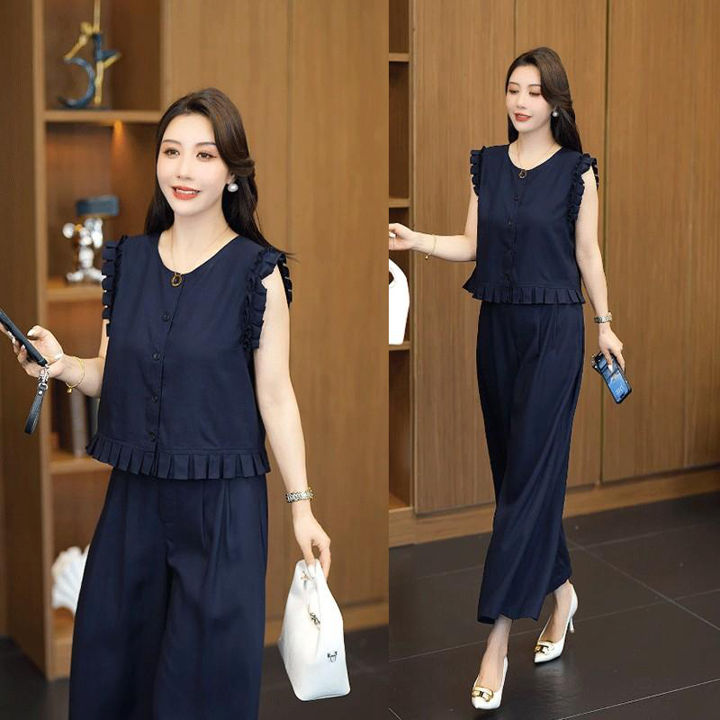 夏季新款时尚洋气木耳无袖短上衣阔腿裤两件套人棉亚麻套装女欧货