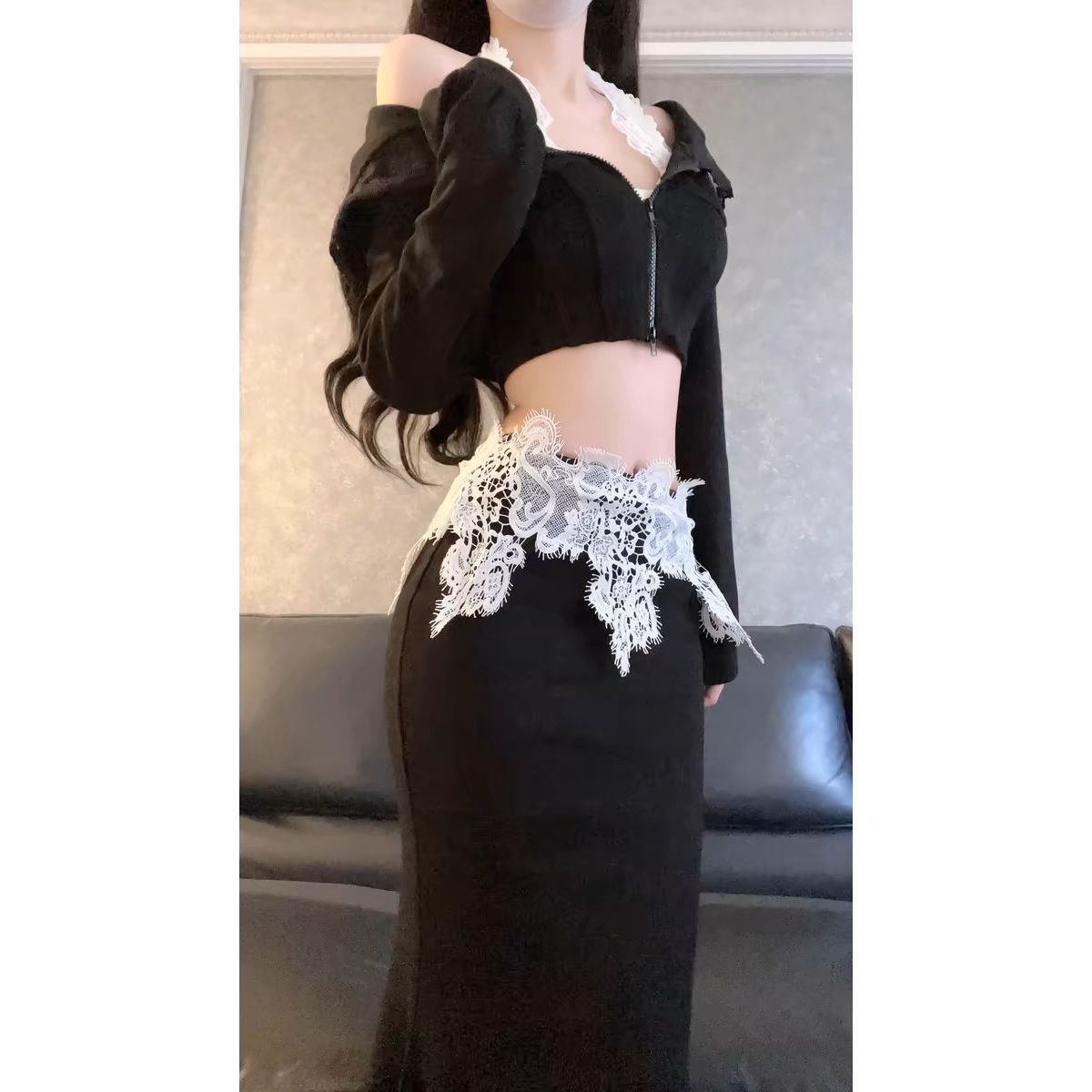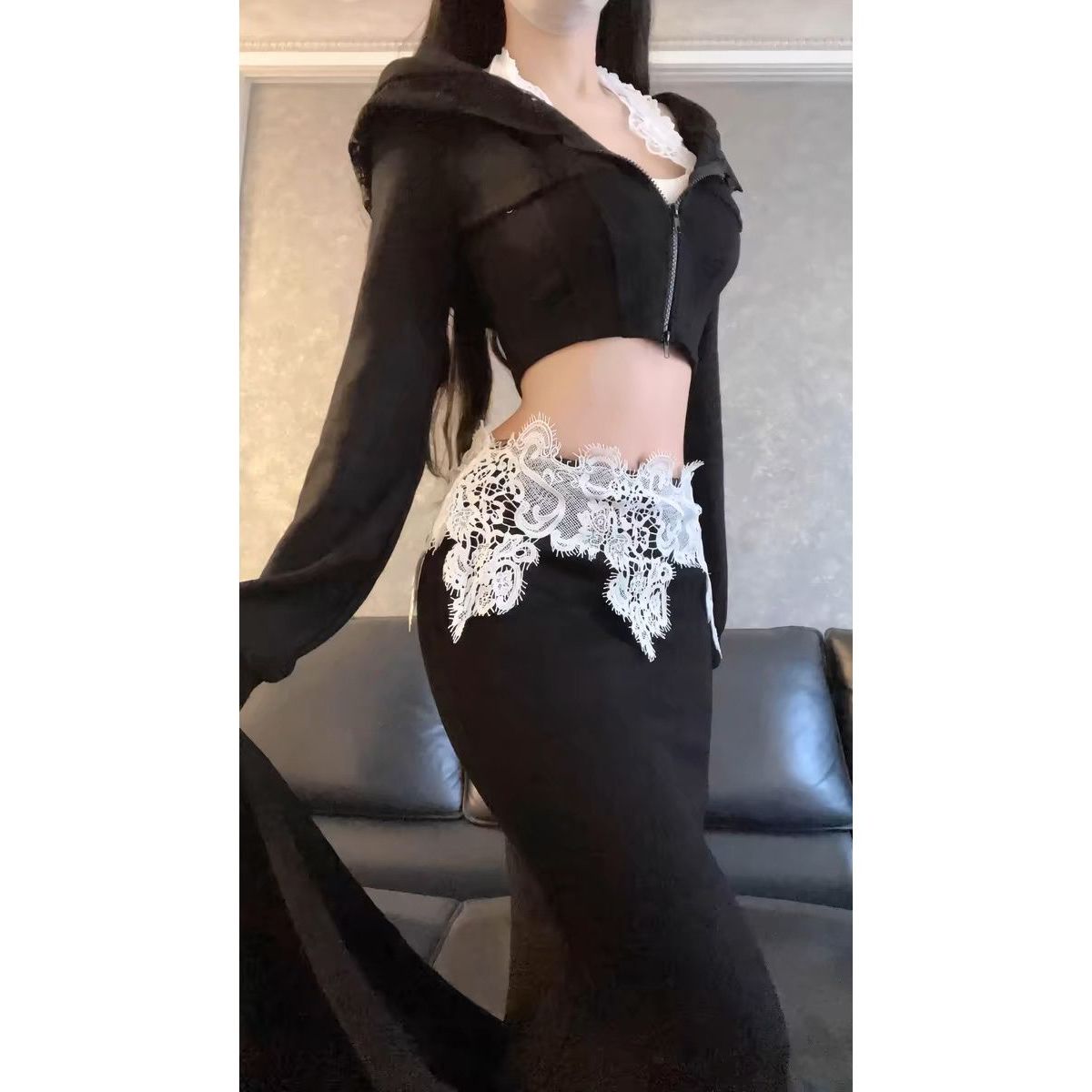 春季新款纯欲风卫衣拼接高腰连帽辣妹上衣+半身裙蕾丝鱼尾两件套