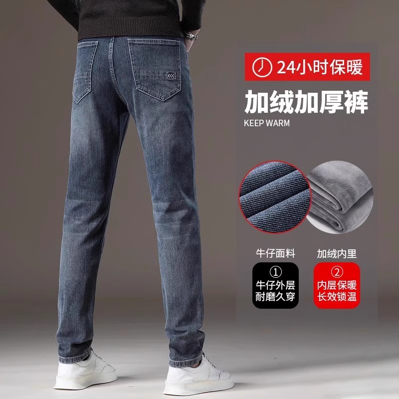 法国冬季加绒加厚牛仔裤男直筒修身弹力保暖商务百搭休闲长裤子