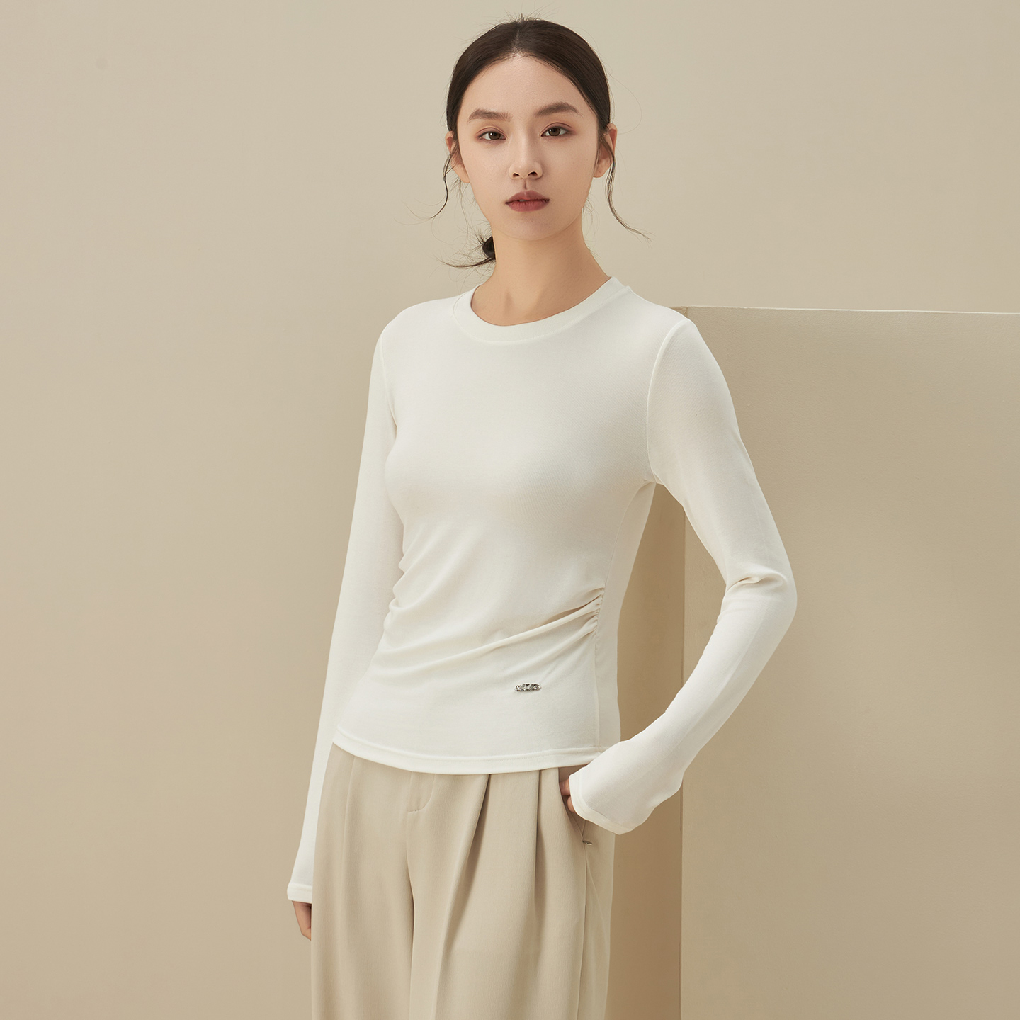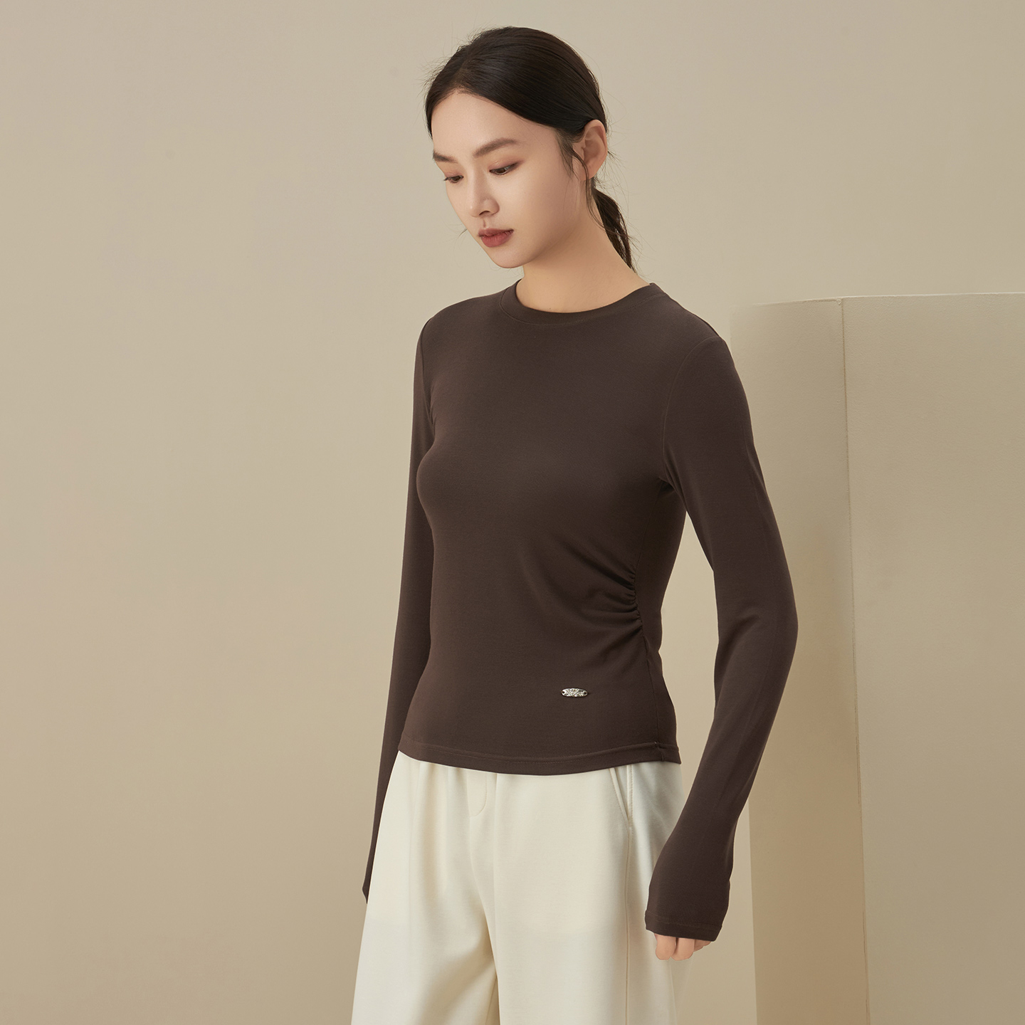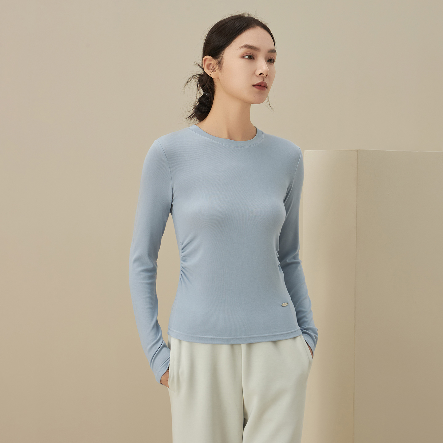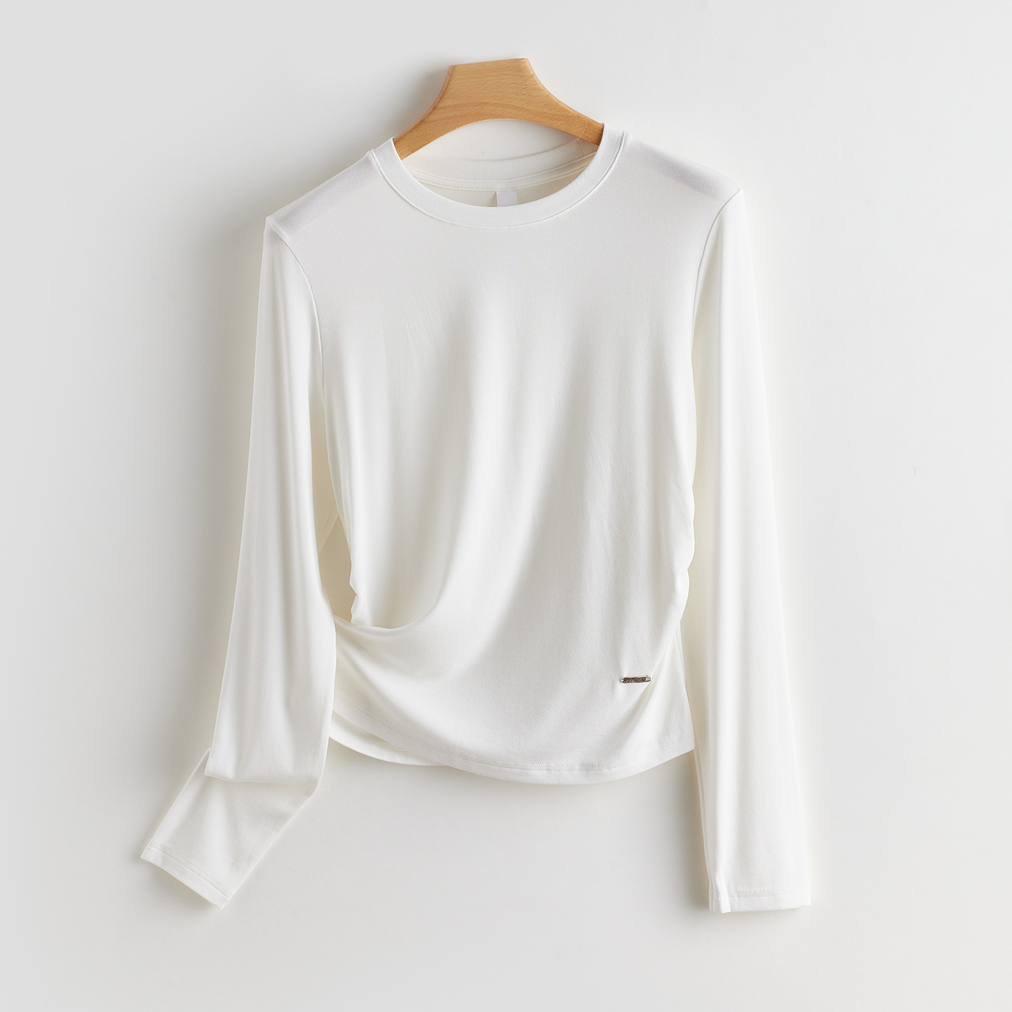 长袖修身打底衫女士T恤春秋季正肩收腰褶皱设计感内搭圆领上衣服