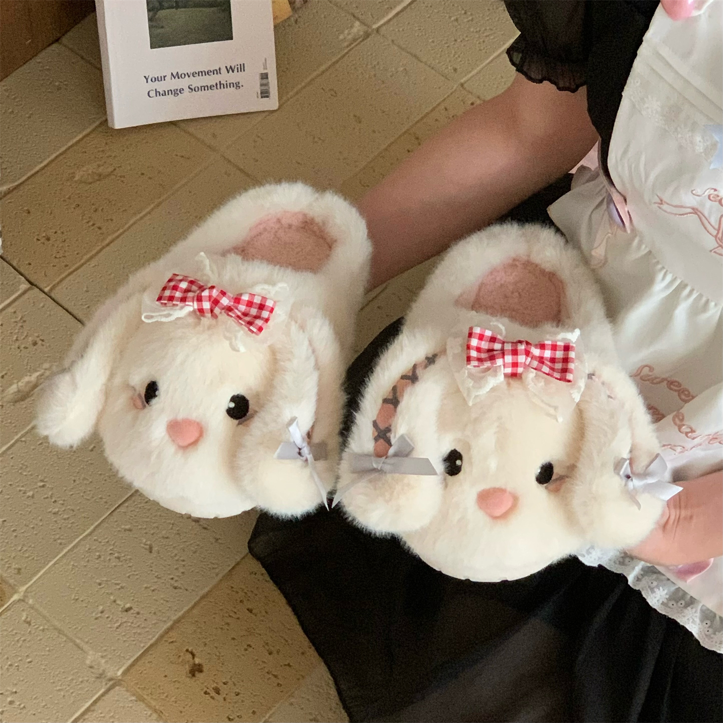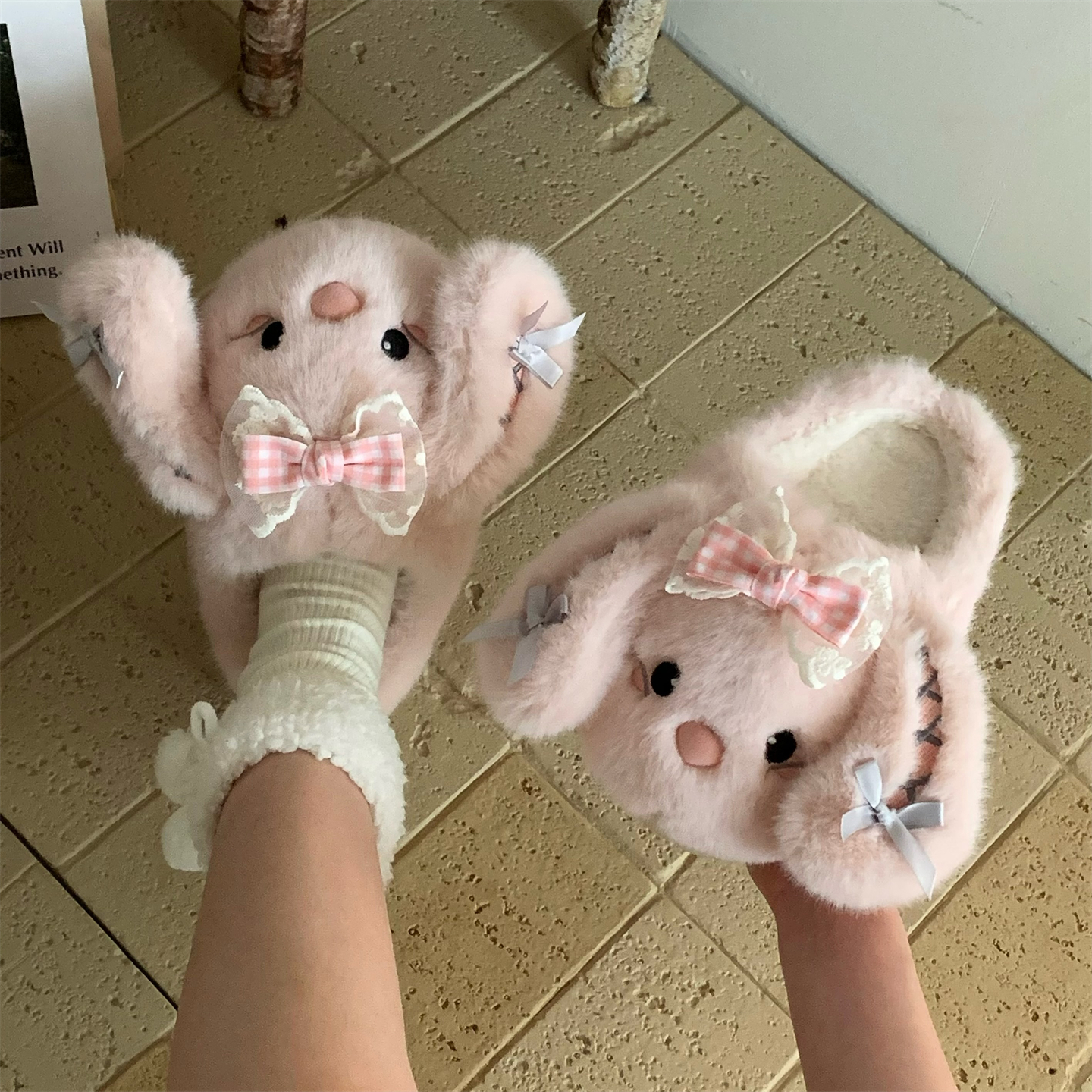女冬可爱蝴蝶结兔子毛毛月子鞋甜美洛丽塔居家新款休闲防滑棉拖鞋