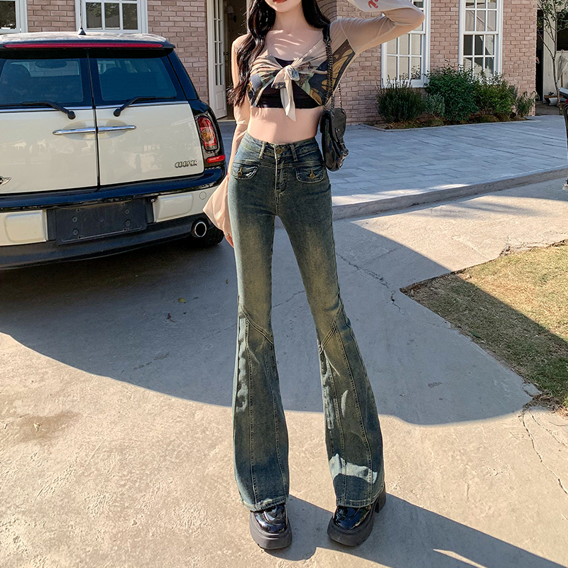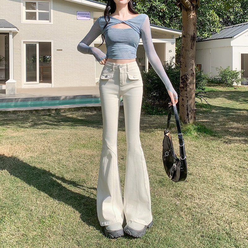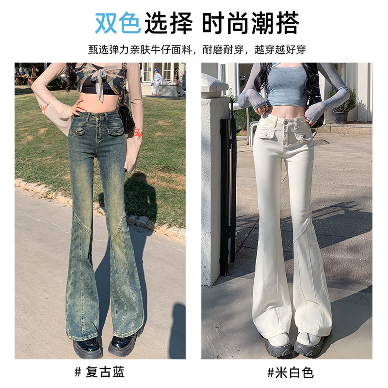 遮肉米白色微喇牛仔裤女2025年春秋款辣妹高腰弹力九分喇叭裤拖地